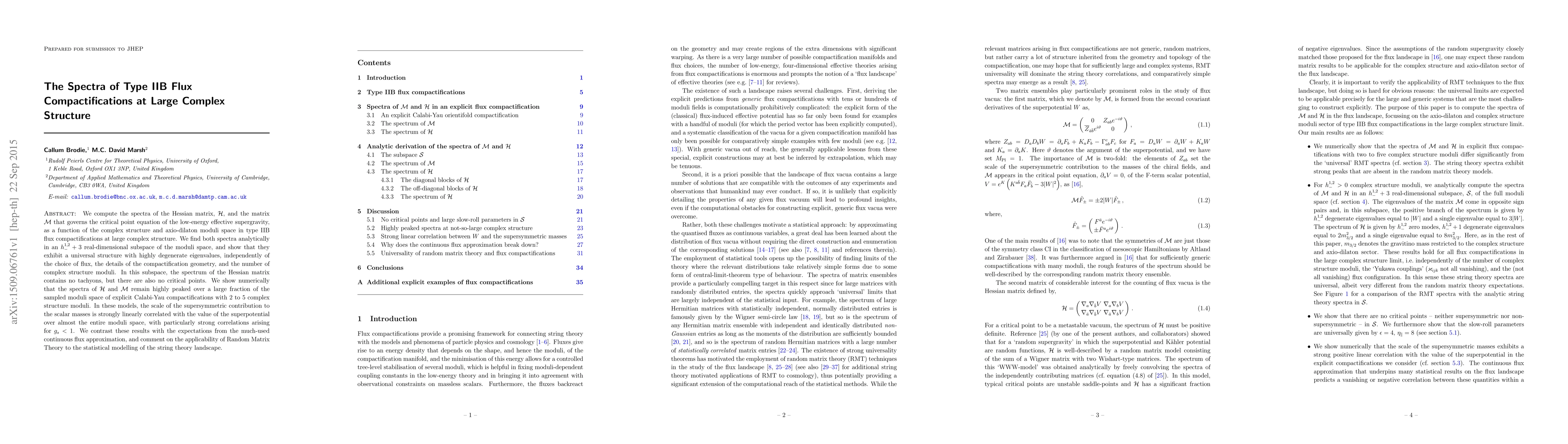 We compute the spectra of the Hessian matrix, ${\cal H}$, and the matrix ${\cal M}$ that governs the critical point equation of the low-energy effective supergravity, as a function of the complex structure and axio-dilaton moduli space in type IIB flux compactifications at large complex structure. We find both spectra analytically in an $h^{1,2}_-+3$ real-dimensional subspace of the moduli space, and show that they exhibit a universal structure with highly degenerate eigenvalues, independently of the choice of flux, the details of the compactification geometry, and the number of complex structure moduli. In this subspace, the spectrum of the Hessian matrix contains no tachyons, but there are also no critical points. We show numerically that the spectra of ${\cal H}$ and ${\cal M}$ remain highly peaked over a large fraction of the sampled moduli space of explicit Calabi-Yau compactifications with 2 to 5 complex structure moduli. In these models, the scale of the supersymmetric contribution to the scalar masses is strongly linearly correlated with the value of the superpotential over almost the entire moduli space, with particularly strong correlations arising for $g_s < 1$. We contrast these results with the expectations from the much-used continuous flux approximation, and comment on the applicability of Random Matrix Theory to the statistical modelling of the string theory landscape.