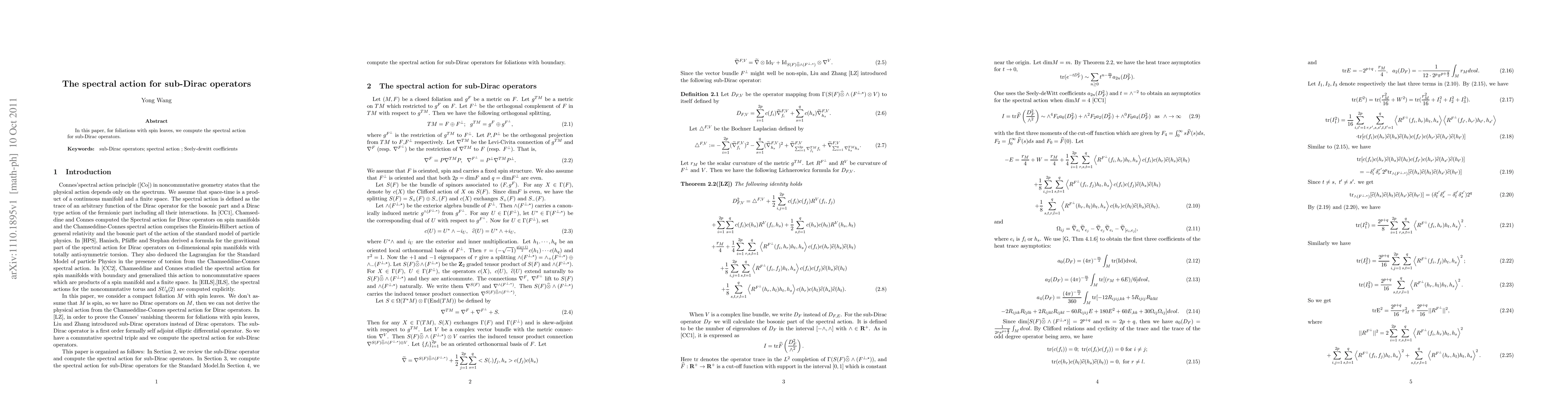 Summary: This paper calculates the spectral action for sub-Dirac operators in the context of foliations featuring spin leaves. The focus is on understanding the geometric and topological implications of these computations.