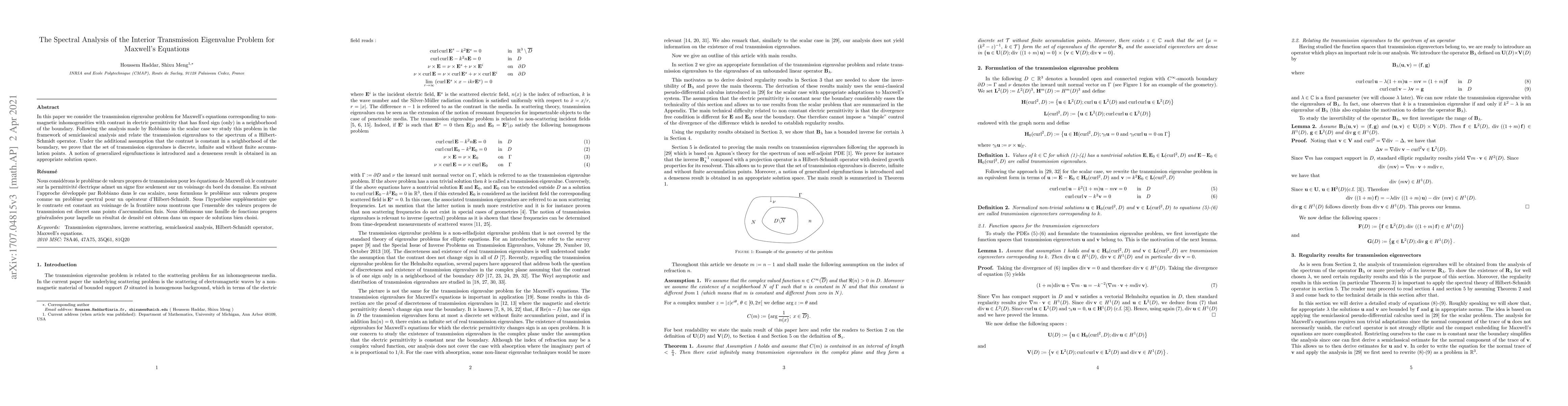Researchers investigate the transmission eigenvalue problem for Maxwell's equations with inhomogeneities having constant contrast in electric permittivity near boundaries, proving that the set of eigenvalues is discrete, infinite, and without accumulation points.
