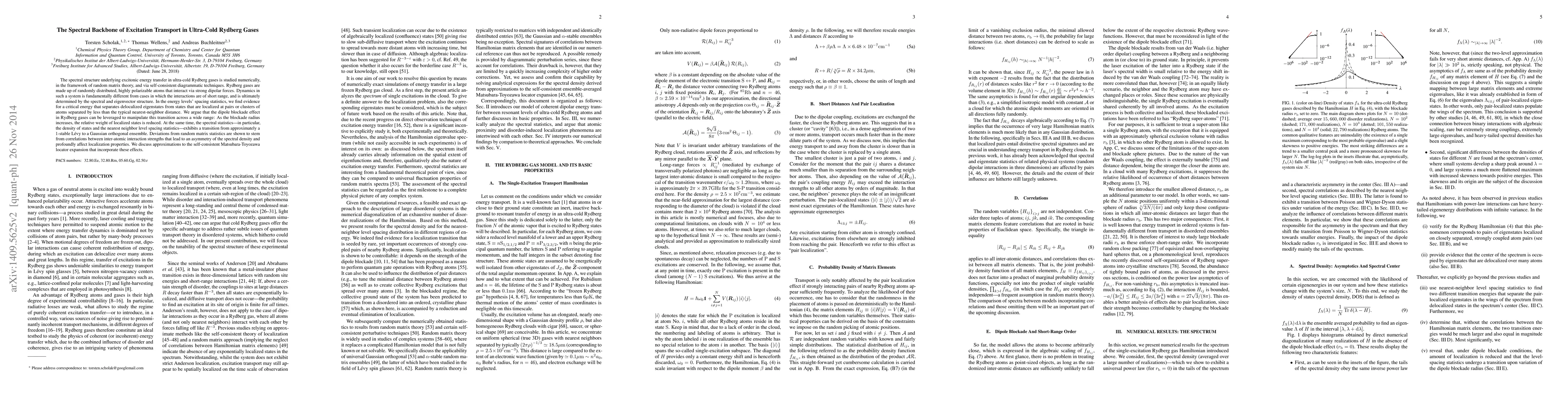 This paper investigates the spectral structure of excitonic energy transfer in ultra-cold Rydberg gases using random matrix theory and self-consistent diagrammatic techniques. It finds a critical energy that distinguishes delocalized from localized states, and demonstrates how the dipole blockade effect can manipulate this transition, leading to a shift in spectral statistics from a 1-stable L\'evy to Gaussian orthogonal ensemble.