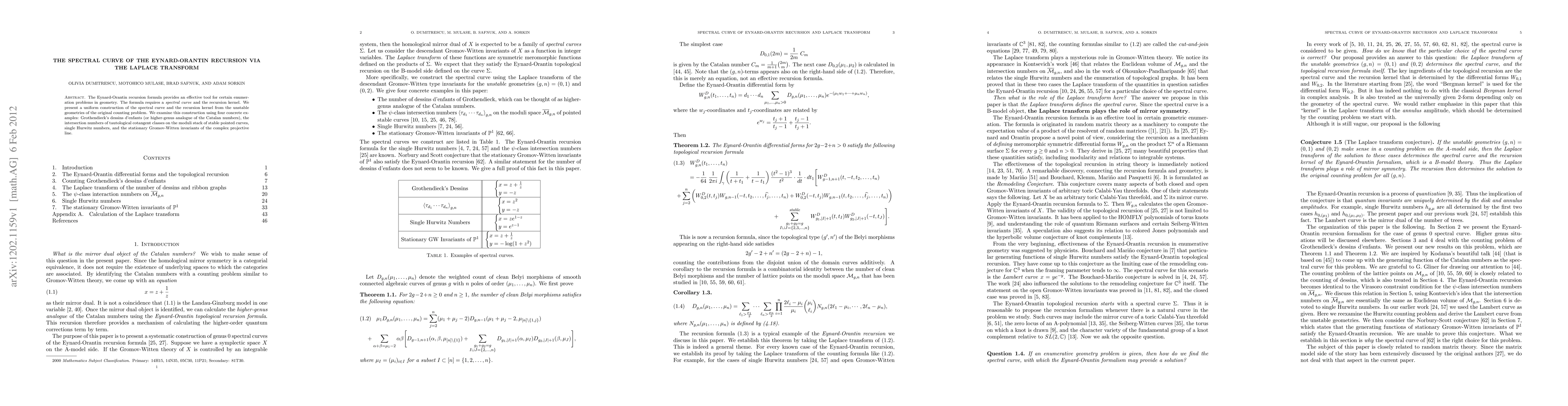 This paper constructs the spectral curve and recursion kernel for the Eynard-Orantin recursion using the Laplace transform, applied to four examples: Grothendieck's dessins d'enfants, intersection numbers on moduli stacks, Hurwitz numbers, and Gromov-Witten invariants.