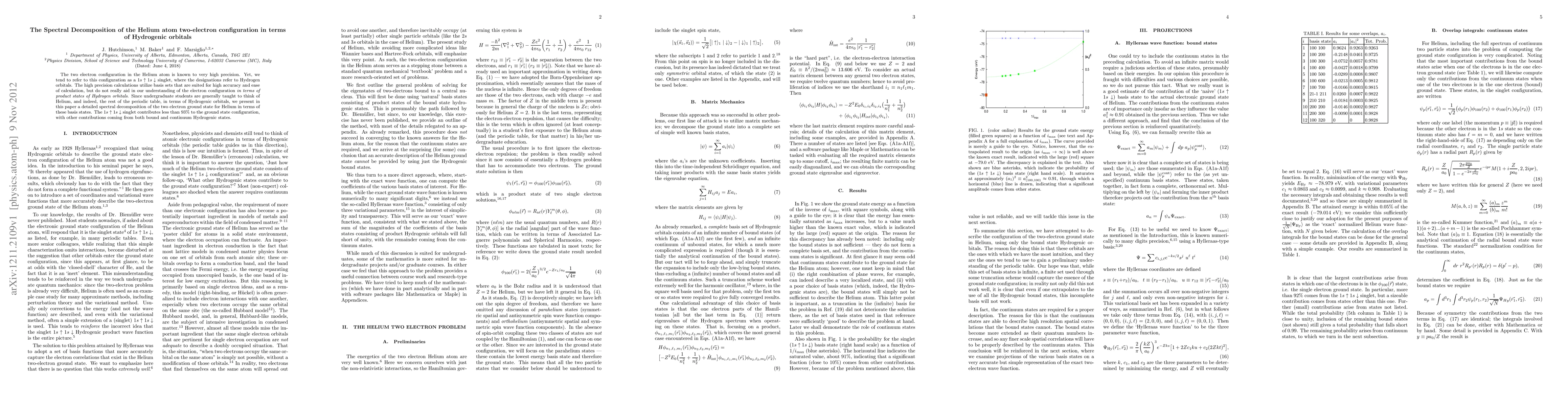 The two electron configuration in the Helium atom is known to very high precision. Yet, we tend to refer to this configuration as a $1s\uparrow 1s\downarrow$ singlet, where the designations refer to Hydrogen orbitals. The high precision calculations utilize basis sets that are suited for high accuracy and ease of calculation, but do not really aid in our understanding of the electron configuration in terms of product states of Hydrogen orbitals. Since undergraduate students are generally taught to think of Helium, and indeed, the rest of the periodic table, in terms of Hydrogenic orbitals, we present in this paper a detailed spectral decomposition of the two electron ground state for Helium in terms of these basis states. The $1s\uparrow 1s\downarrow$ singlet contributes less than 93% to the ground state configuration, with other contributions coming from both bound and continuum Hydrogenic states.