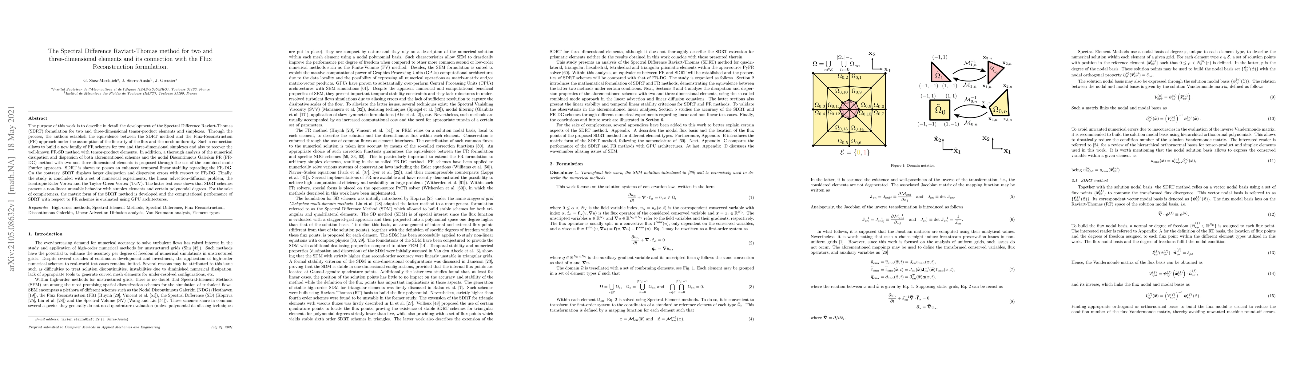 The purpose of this work is to describe in detail the development of the Spectral Difference Raviart-Thomas (SDRT) formulation for two and three-dimensional tensor-product elements and simplexes. Through the process, the authors establish the equivalence between the SDRT method and the Flux-Reconstruction (FR) approach under the assumption of the linearity of the flux and the mesh uniformity. Such a connection allows to build a new family of FR schemes for two and three-dimensional simplexes and also to recover the well-known FR-SD method with tensor-product elements. In addition, a thorough analysis of the numerical dissipation and dispersion of both aforementioned schemes and the nodal Discontinuous Galerkin FR (FR-DG) method with two and three-dimensional elements is proposed through the use of the combined-mode Fourier approach. SDRT is shown to possess an enhanced temporal linear stability regarding the FR-DG. On the contrary, SDRT displays larger dissipation and dispersion errors with respect to FR-DG. Finally, the study is concluded with a set of numerical experiments, the linear advection-diffusion problem, the Isentropic Euler Vortex and the Taylor-Green Vortex (TGV). The latter test case shows that SDRT schemes present a non-linear unstable behavior with simplex elements and certain polynomial degrees. For the sake of completeness, the matrix form of the SDRT method is developed and the computational performance of SDRT with respect to FR schemes is evaluated using GPU architectures.