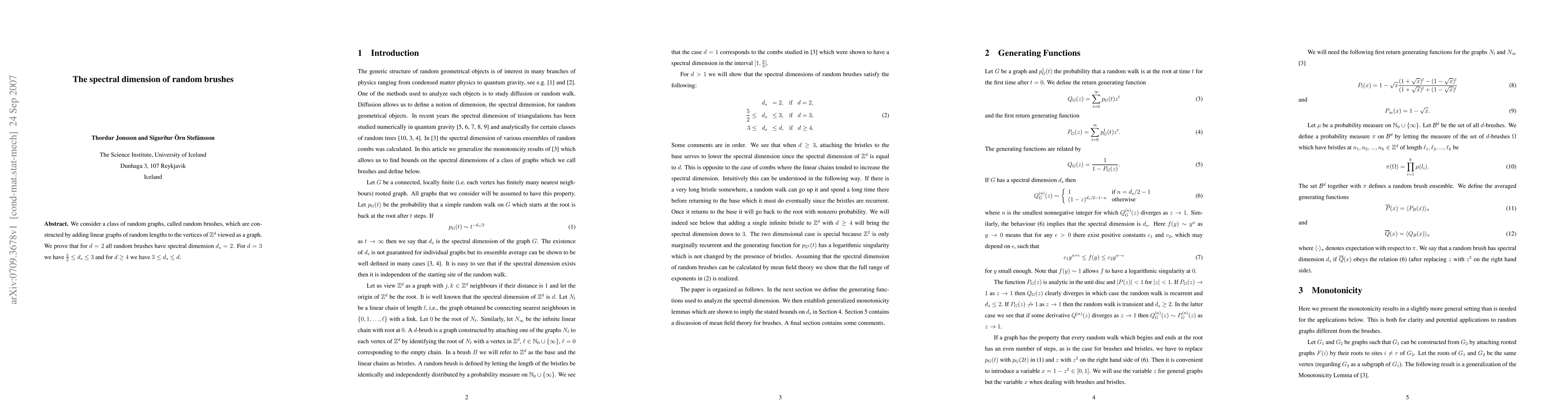 Summary: This paper studies random brushes, a class of random graphs formed by attaching linear graphs to vertices of Z^d. It finds that the spectral dimension d_s is 2 for d=2, between 2.5 and 3 for d=3, and between 3 and d for d ≥ 4.