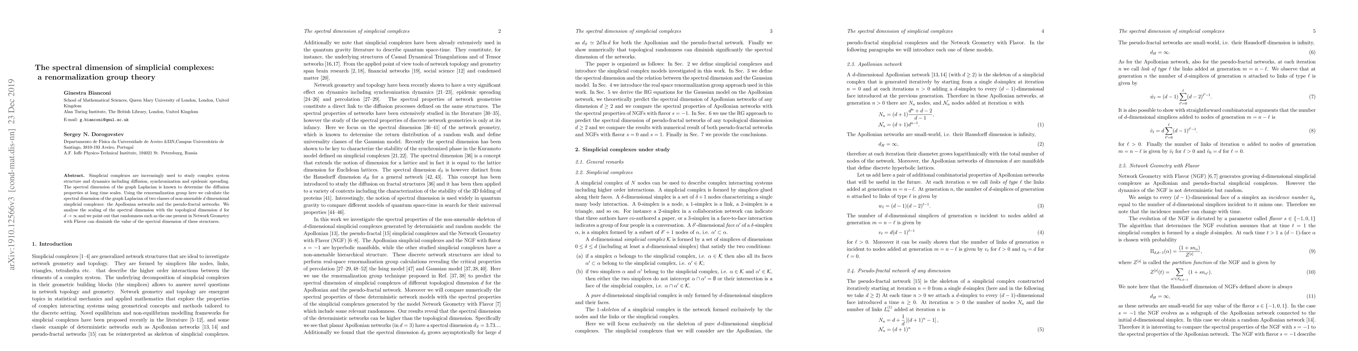 This paper employs renormalization group theory to calculate the spectral dimension of graph Laplacians in simplicial complexes, specifically focusing on Apollonian and pseudo-fractal networks. It finds that the spectral dimension scales with topological dimension and that randomness can reduce this dimension in complex systems.