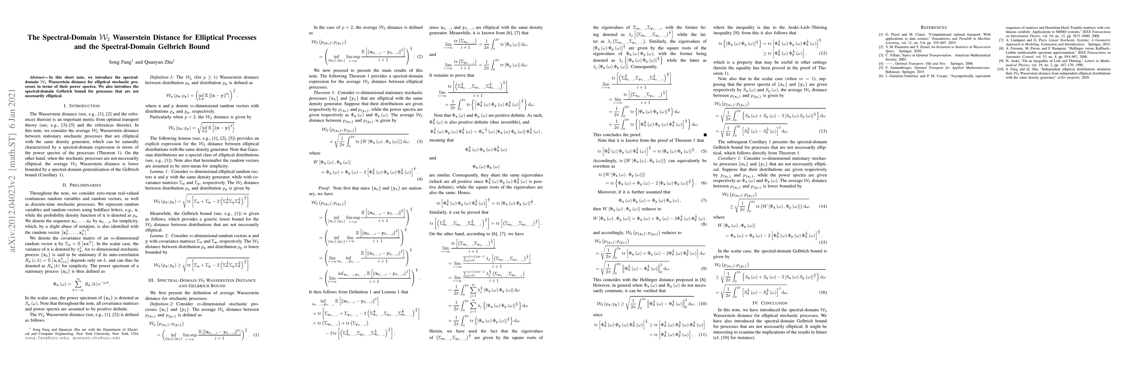 Summary: This paper introduces the spectral-domain $\mathcal{W}_2$ Wasserstein distance for elliptical stochastic processes using their power spectra and presents the spectral-domain Gelbrich bound for non-elliptical processes.