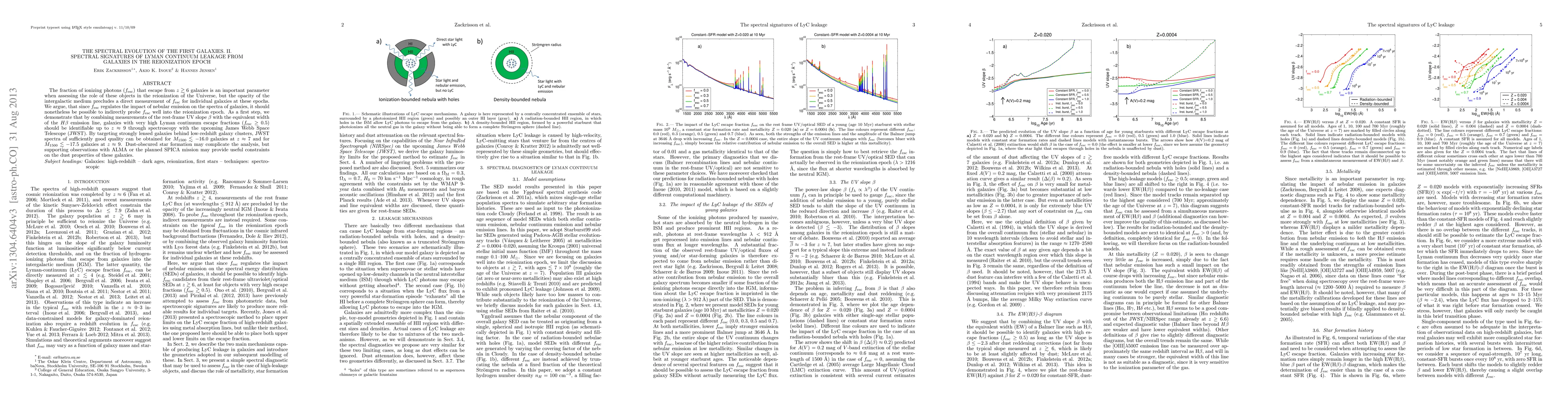 This paper investigates the spectral signatures of Lyman continuum leakage from high-redshift galaxies, which are crucial for understanding their contribution to cosmic reionization. It proposes a method to indirectly measure the escape fraction of ionizing photons using UV slope and Hb emission line width, enabling identification of galaxies with high Lyman continuum escape fractions up to z~9 via JWST spectroscopy.
