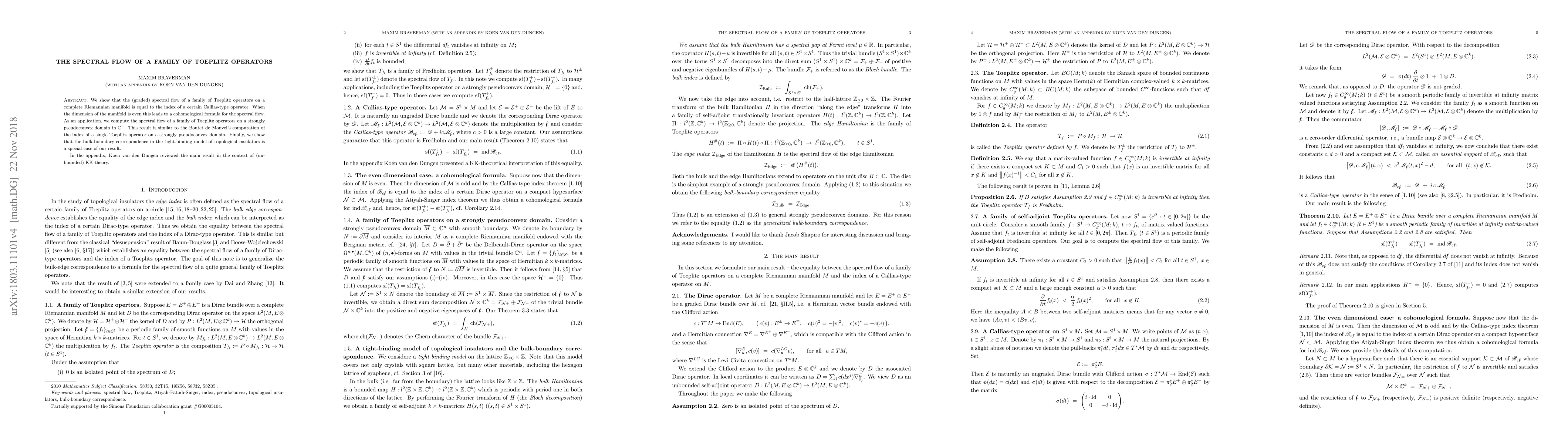 We show that the (graded) spectral flow of a family of Toeplitz operators on a complete Riemannian manifold is equal to the index of a certain Callias-type operator. When the dimension of the manifold is even this leads to a cohomological formula for the spectral flow. As an application, we compute the spectral flow of a family of Toeplitz operators on a strongly pseudoconvex domain in $C^n$. This result is similar to the Boutet de Monvel's computation of the index of a single Toeplitz operator on a strongly pseudoconvex domain. Finally, we show that the bulk-boundary correspondence in a tight-binding model of topological insulators is a special case of our result. In the appendix, Koen van den Dungen reviewed the main result in the context of (unbounded) KK-theory.