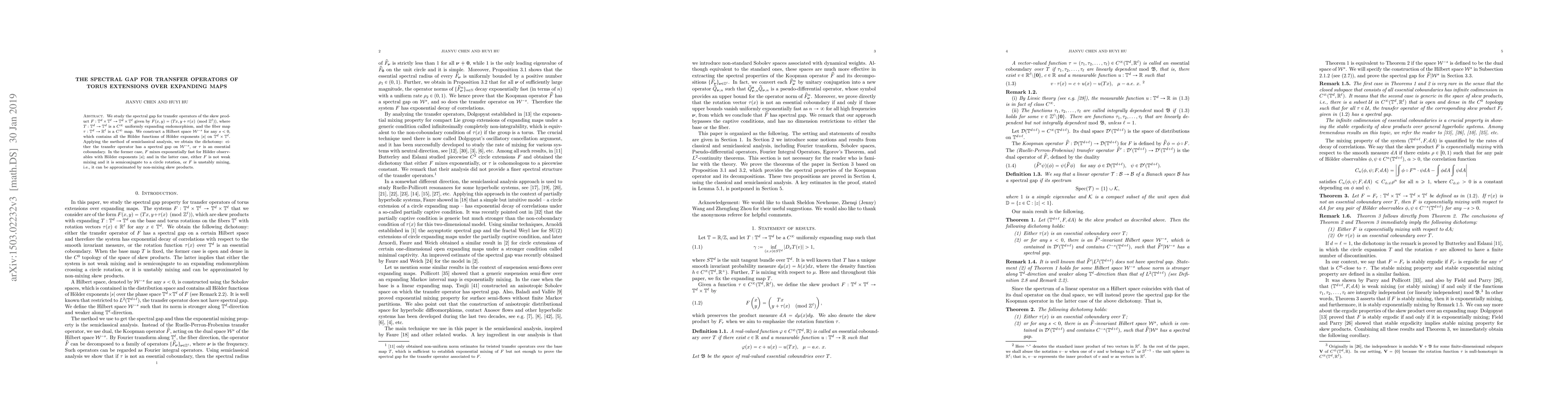 This paper investigates the spectral gap for transfer operators associated with torus extensions over expanding maps, revealing that the operator either exhibits a spectral gap or the fiber map is an essential coboundary. The former implies exponential mixing for Hölder observables, while the latter indicates either non-mixing or approximable by non-mixing skew products.