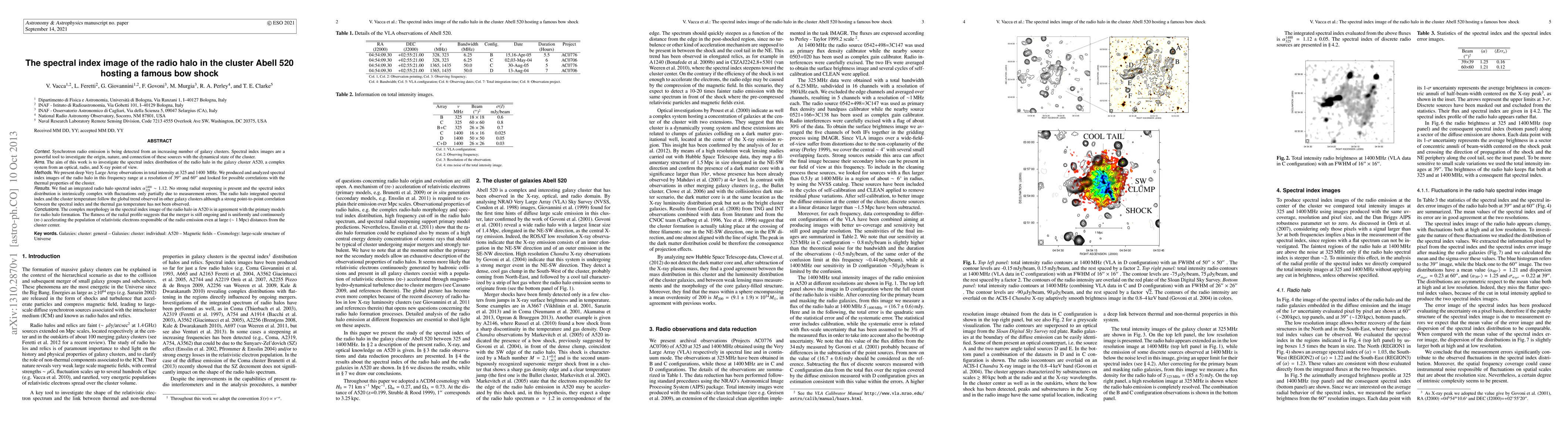 The radio halo in galaxy cluster Abell 520 shows a flat spectral index with no strong radial steepening, indicating ongoing merger activity that accelerates relativistic electrons responsible for radio emission.