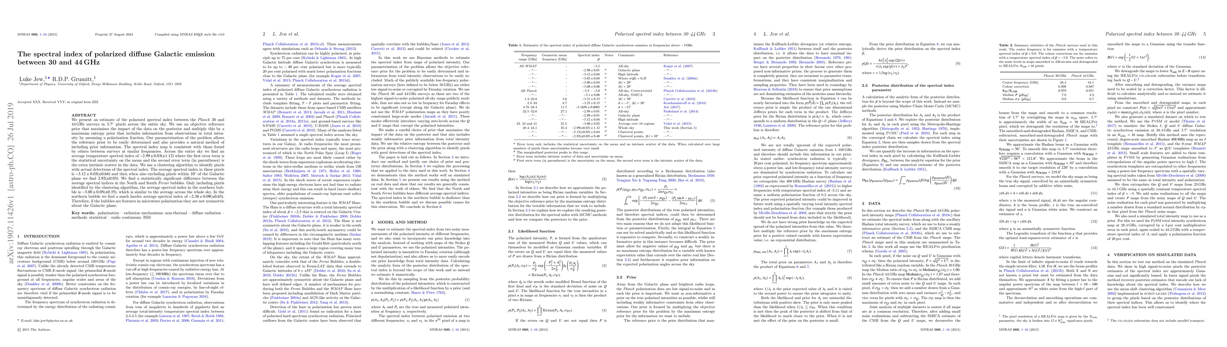Researchers mapped polarized diffuse Galactic emission across the sky between 30-44 GHz frequencies, finding an average spectral index of -2.99, with notable differences in the northern and southern Fermi bubbles.