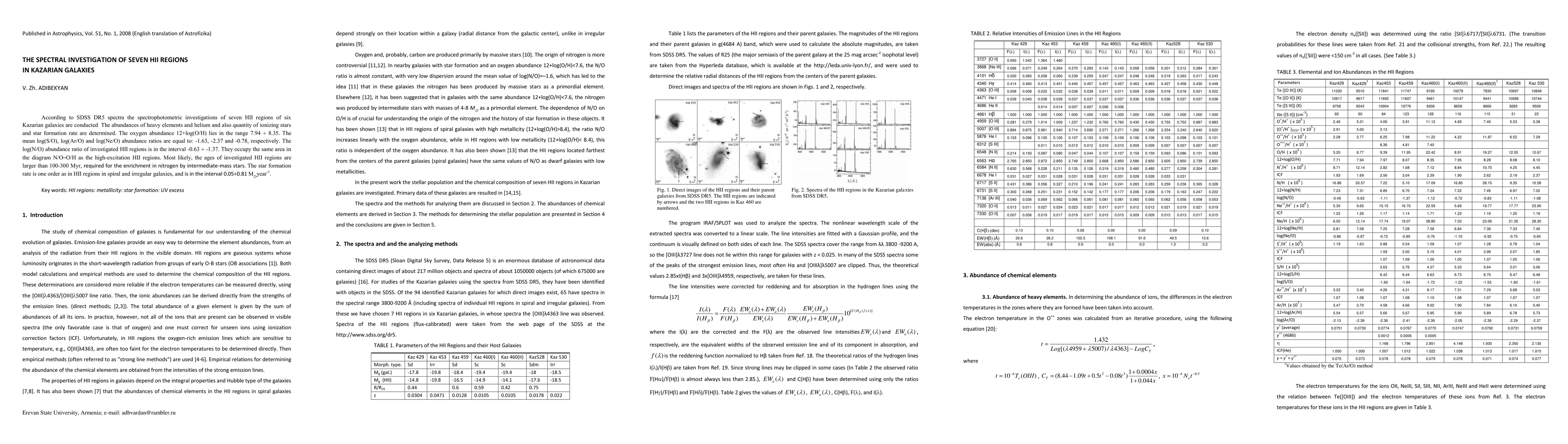 This study, using SDSS DR5 spectra, examines seven HII regions across six Kazarian galaxies. It finds oxygen abundances ranging from 7.94 to 8.35, with helium and heavy element abundance ratios also determined. The research suggests most HII regions are older than 100-300 Myr, indicating enrichment in nitrogen by intermediate-mass stars. The star formation rate is comparable to that in spiral and irregular galaxies, varying from 0.05 to 0.81 M/year.