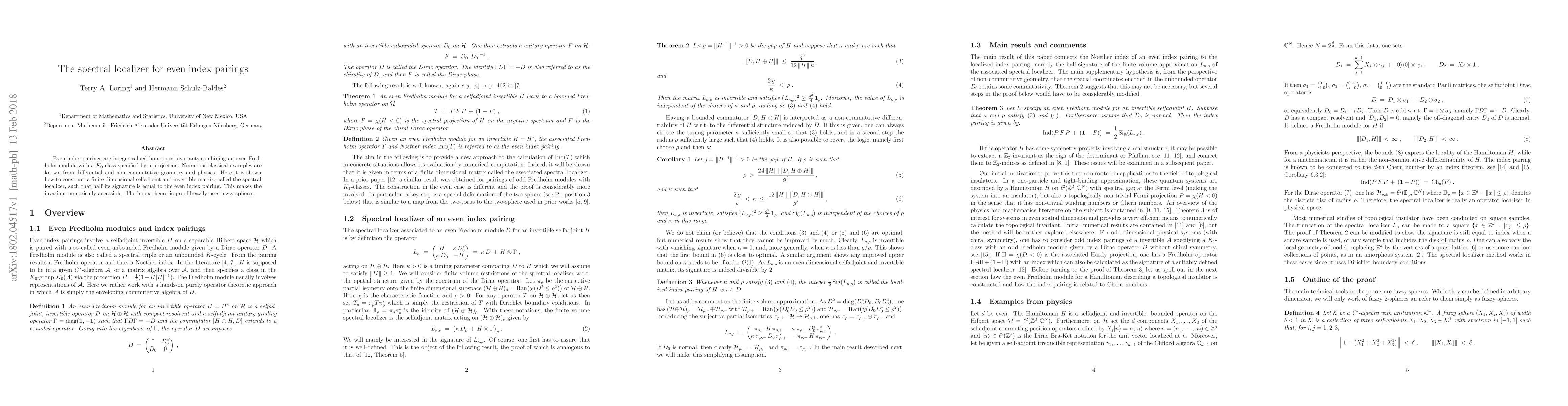 This paper constructs a spectral localizer, a finite-dimensional selfadjoint and invertible matrix, to numerically access even index pairings, which are homotopy invariants combining even Fredholm modules and $K_0$-classes. The proof leverages fuzzy spheres for its index-theoretic foundation.