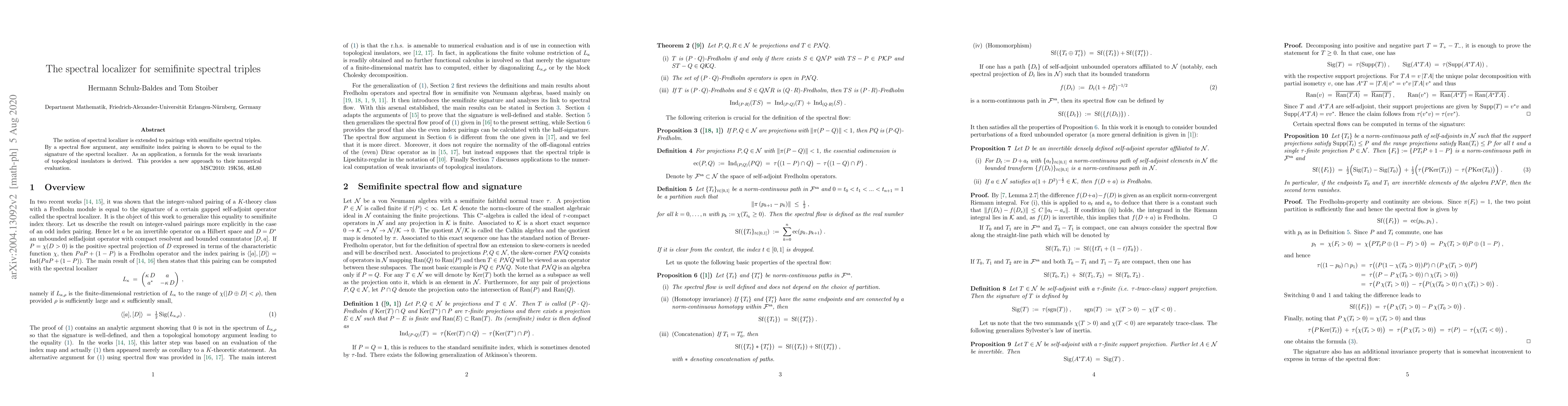 The paper extends the concept of spectral localizer to semifinite spectral triples and demonstrates that any semifinite index pairing equals the signature of the spectral localizer, thereby offering a novel method for evaluating the weak invariants of topological insulators.
