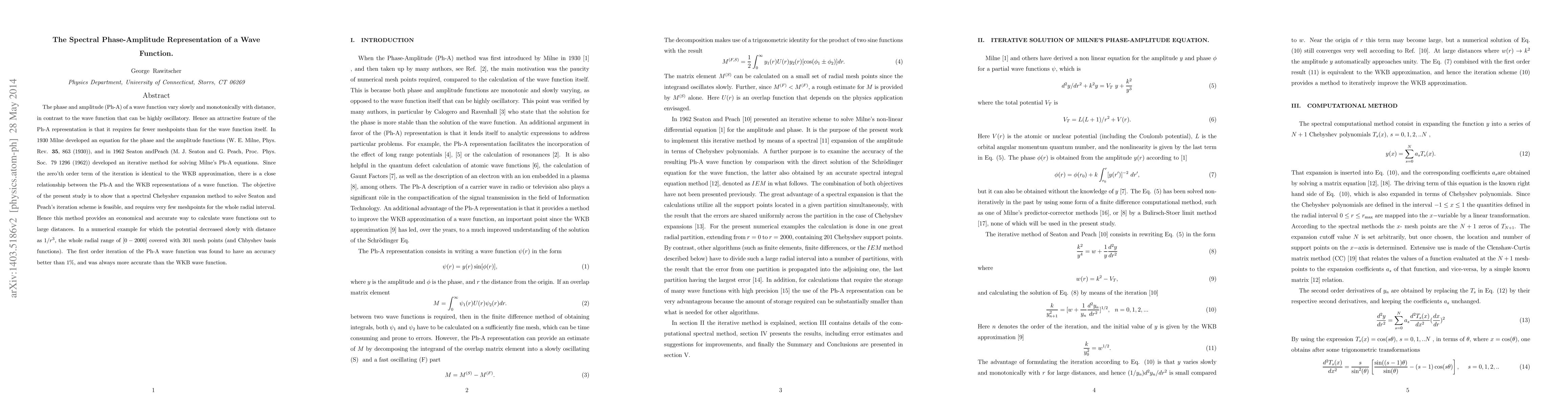 The phase and amplitude (Ph-A) of a wave function vary slowly and monotonically with distance, in contrast to the wave function that can be highly oscillatory. Hence an attractive feature of the Ph-A representation is that it requires far fewer meshpoints than for the wave function itself. In 1930 Milne developed an equation for the phase and the amplitude functions (W. E. Milne, Phys. Rev. 35, 863 (1930)), and in 1962 Seaton andPeach (M. J. Seaton and G. Peach, Proc. Phys. Soc. 79 1296 (1962)) developed an iterative method for solving Milne's Ph-A equations. Since the zero'th order term of the iteration is identical to the WKB approximation, there is a close relationship between the Ph-A and the WKB representations of a wave function. The objective of the present study is to show that a spectral Chebyshev expansion method to solve Seaton and Peach's iteration scheme is feasible, and requires very few meshpoints for the whole radial interval. Hence this method provides an economical and accurate way to calculate wave functions out to large distances. In a numerical example for which the potential decreased slowly with distance as 1/r^3, the whole radial range of [0-2000] covered with 301 mesh points (and Chbyshev basis functions). The first order iteration of the Ph-A wave function was found to have an accuracy better than 1%, and was always more accurate than the WKB wave function.