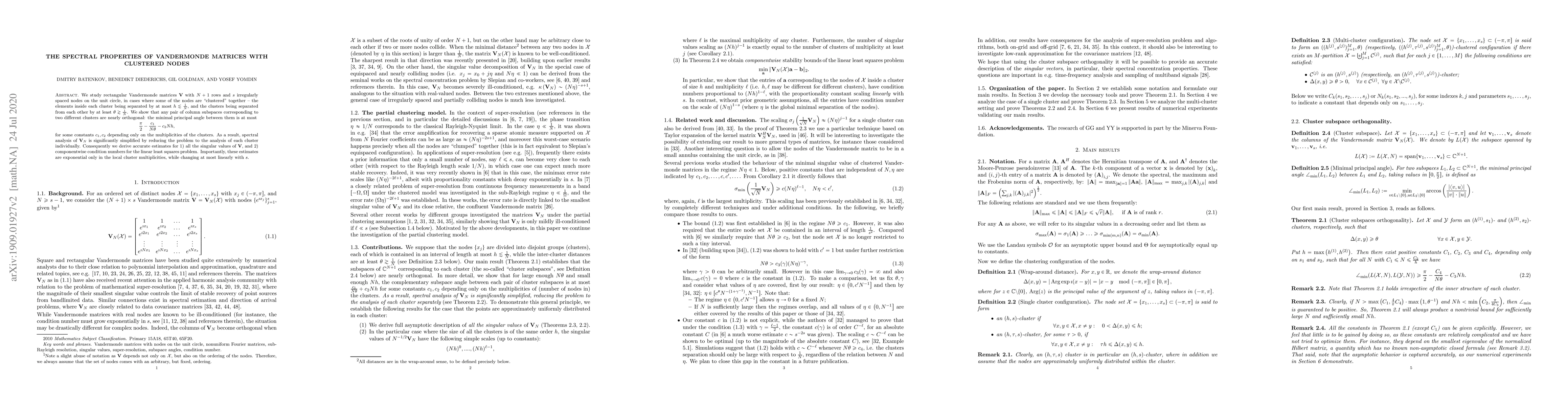 We study rectangular Vandermonde matrices $\mathbf{V}$ with $N+1$ rows and $s$ irregularly spaced nodes on the unit circle, in cases where some of the nodes are "clustered" together -- the elements inside each cluster being separated by at most $h \lesssim {1\over N}$, and the clusters being separated from each other by at least $\theta \gtrsim {1\over N}$. We show that any pair of column subspaces corresponding to two different clusters are nearly orthogonal: the minimal principal angle between them is at most $$\frac{\pi}{2}-\frac{c_1}{N \theta}-c_2 N h,$$ for some constants $c_1,c_2$ depending only on the multiplicities of theclusters. As a result, spectral analysis of $\mathbf{V}_N$ is significantly simplified by reducing the problem to the analysis of each cluster individually. Consequently we derive accurate estimates for 1) all the singular values of $\mathbf{V}$, and 2) componentwise condition numbers for the linear least squares problem. Importantly, these estimates are exponential only in the local cluster multiplicities, while changing at most linearly with $s$.
