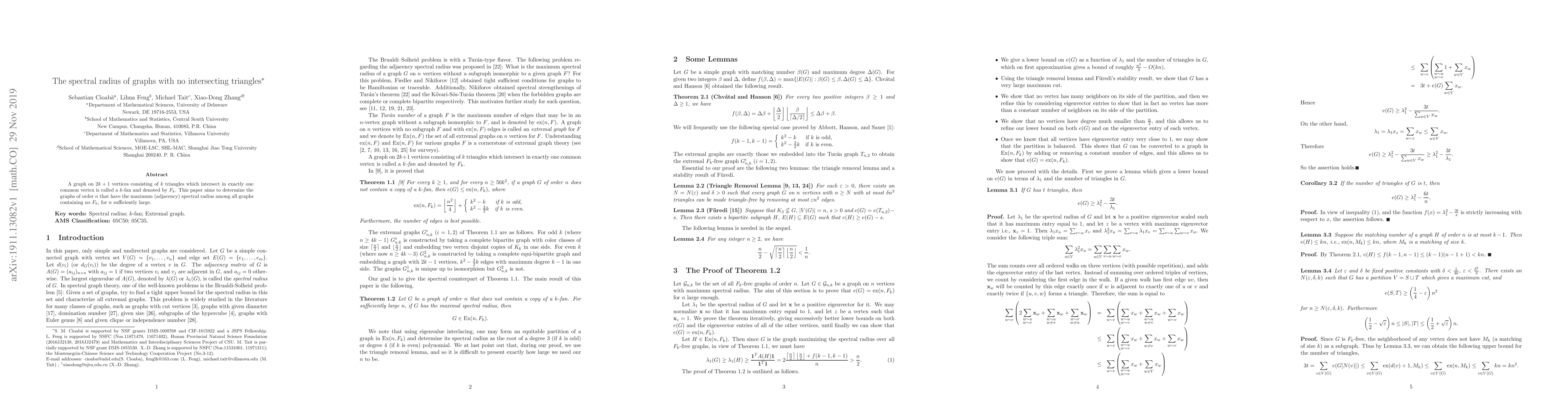 A graph on $2k+1$ vertices consisting of $k$ triangles which intersect in exactly one common vertex is called a $k$-fan and denoted by $F_k$. This paper aims to determine the graphs of order $n$ that have the maximum (adjacency) spectral radius among all graphs containing no $F_k$, for $n$ sufficiently large.