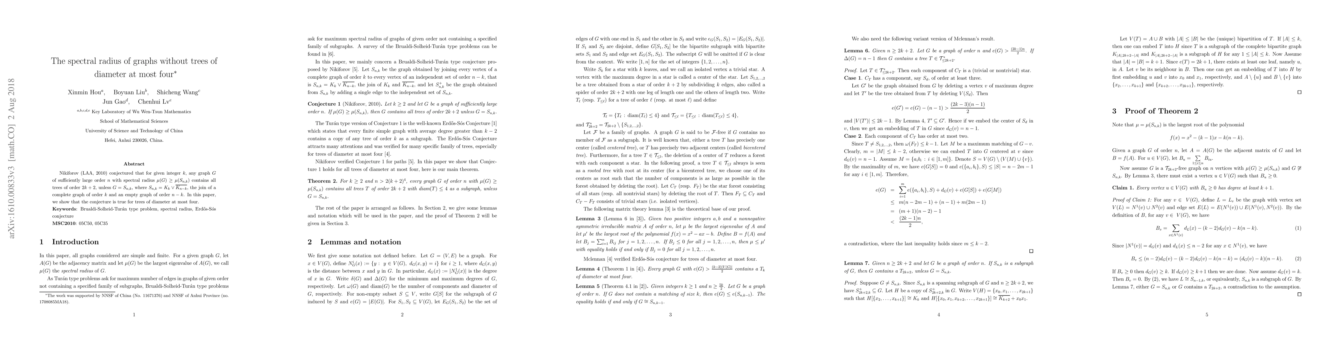 This paper confirms Nikiforov's conjecture for graphs of sufficiently large order containing all trees of diameter at most four, provided their spectral radius meets a certain criterion. It demonstrates that such graphs must include all trees of order $2k+2$, unless they are specifically structured as $S_{n,k}$.