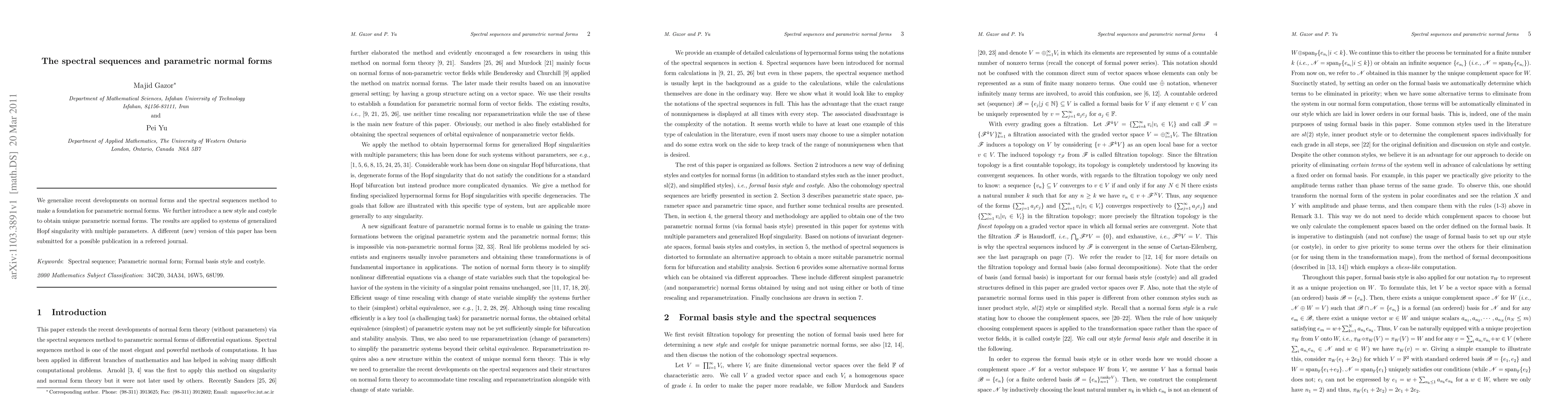 This paper generalizes normal forms and spectral sequences to establish a foundation for parametric normal forms, introducing new style and costyle for uniqueness. It applies these results to systems of generalized Hopf singularities with multiple parameters.