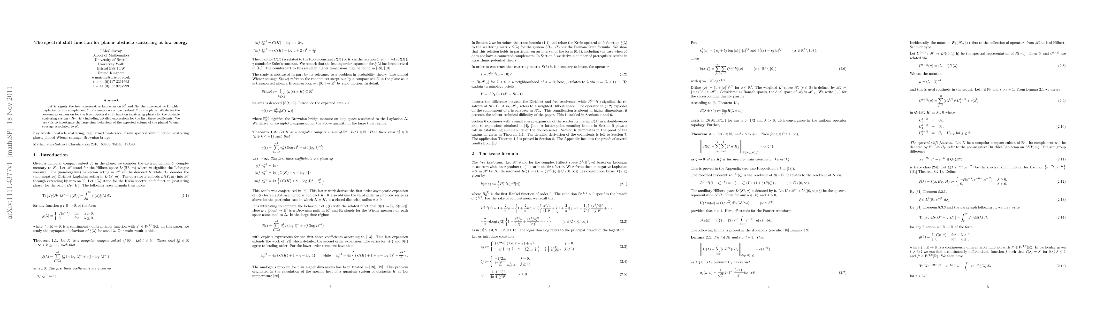 Let $H$ signify the free non-negative Laplacian on $\mathbb{R}^2$ and $H_Y$ the non-negative Dirichlet Laplacian on the complement $Y$ of a nonpolar compact subset $K$ in the plane. We derive the low-energy expansion for the Krein spectral shift function (scattering phase) for the obstacle scattering system $\{\,H_Y,\,H\,\}$ including detailed expressions for the first three coefficients. We use this to investigate the large time behaviour of the expected volume of the pinned Wiener sausage associated to $K$.