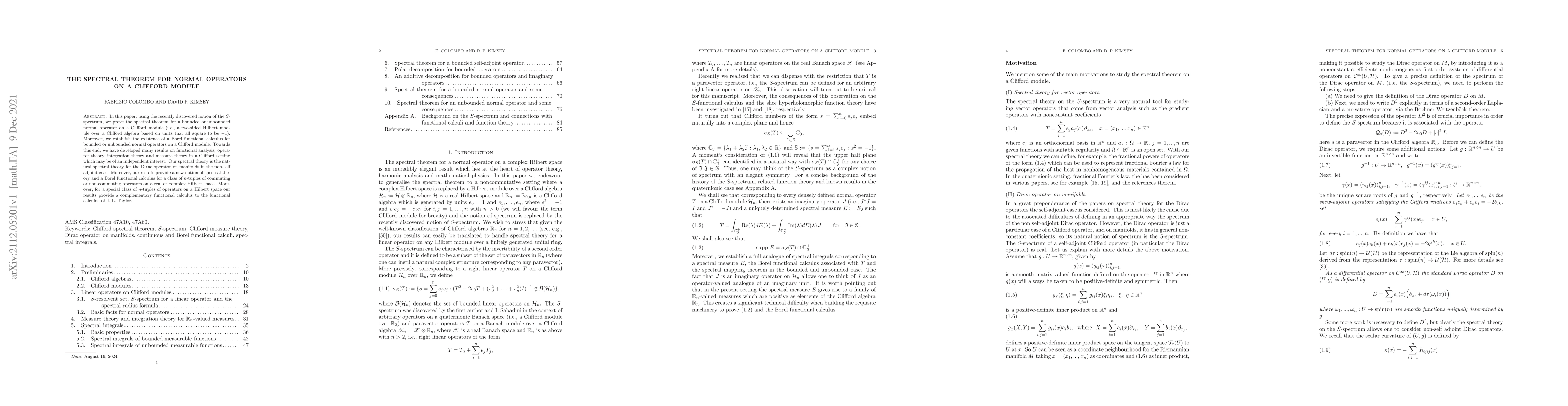 This paper proves the spectral theorem for normal operators on Clifford modules using the $S$-spectrum, establishing a Borel functional calculus and developing functional analysis results for Clifford settings. The spectral theory extends naturally to the Dirac operator on non-self-adjoint manifolds.