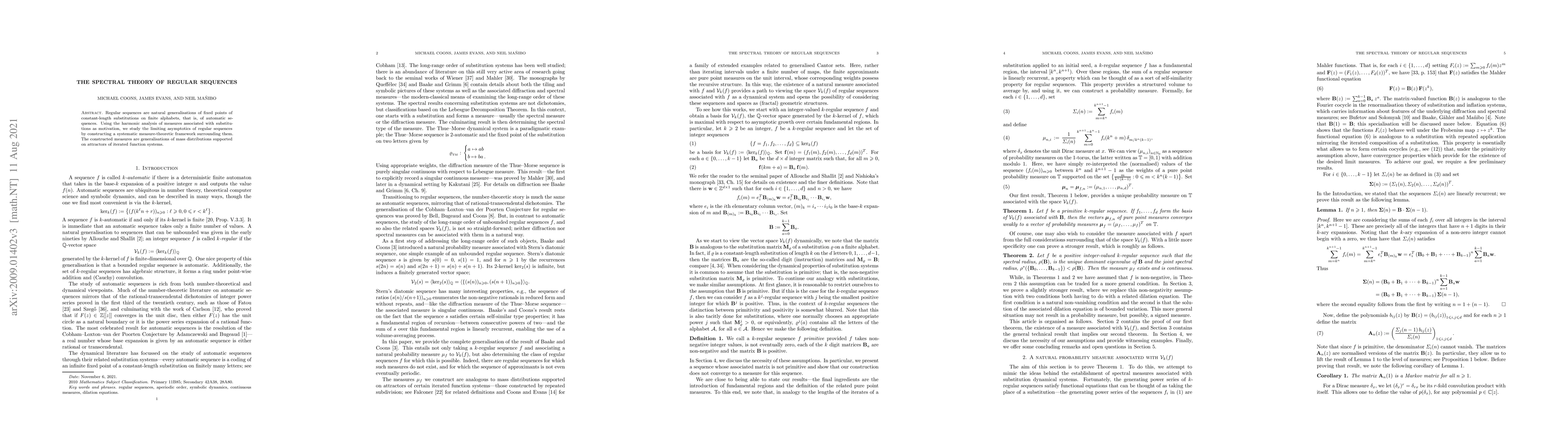 This paper develops a measure-theoretic framework to study the spectral properties of regular sequences, generalizing automatic sequences, by analyzing the limiting asymptotics through associated measures and harmonic analysis. The measures are extensions of mass distributions on attractors of iterated function systems.