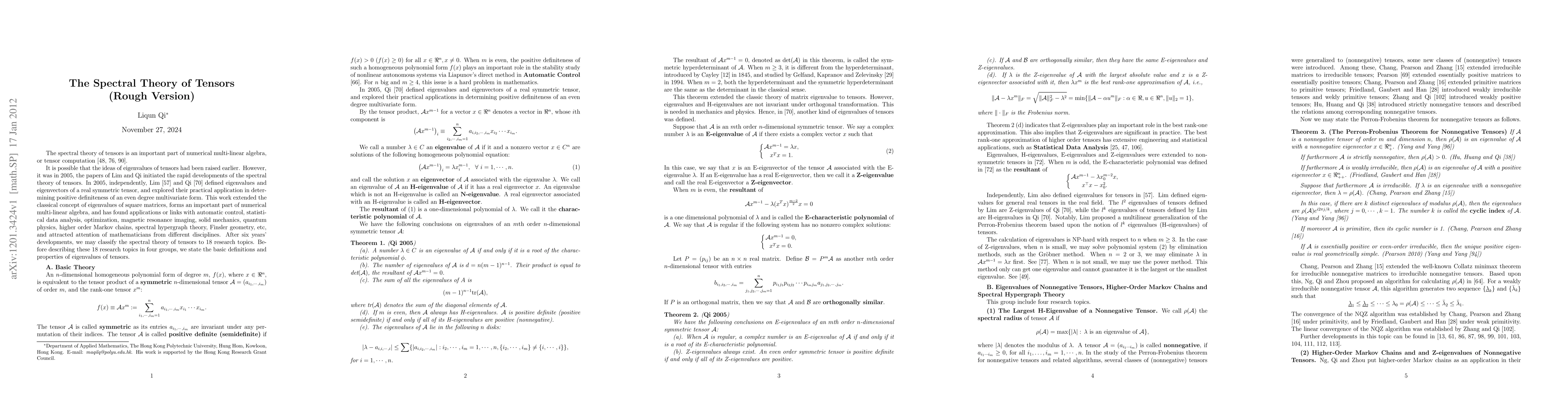 Summary: This paper provides an overview of the spectral theory of tensors, exploring their properties and applications in mathematical analysis. It aims to elucidate the fundamental concepts and recent developments in this field.
