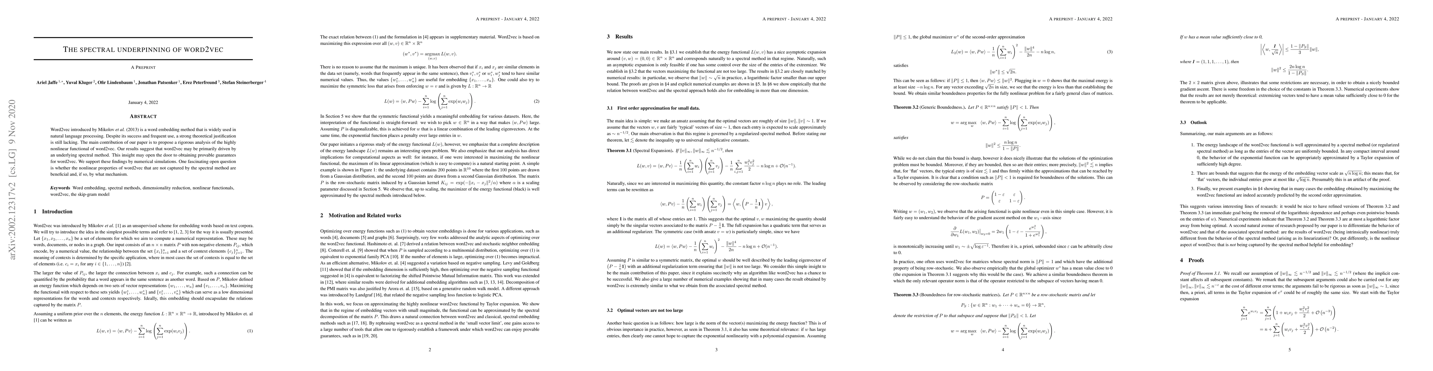 The paper proposes a rigorous analysis of the highly nonlinear functional of word2vec, suggesting it may be primarily driven by an underlying spectral method. This is supported by numerical simulations and theoretical justifications.