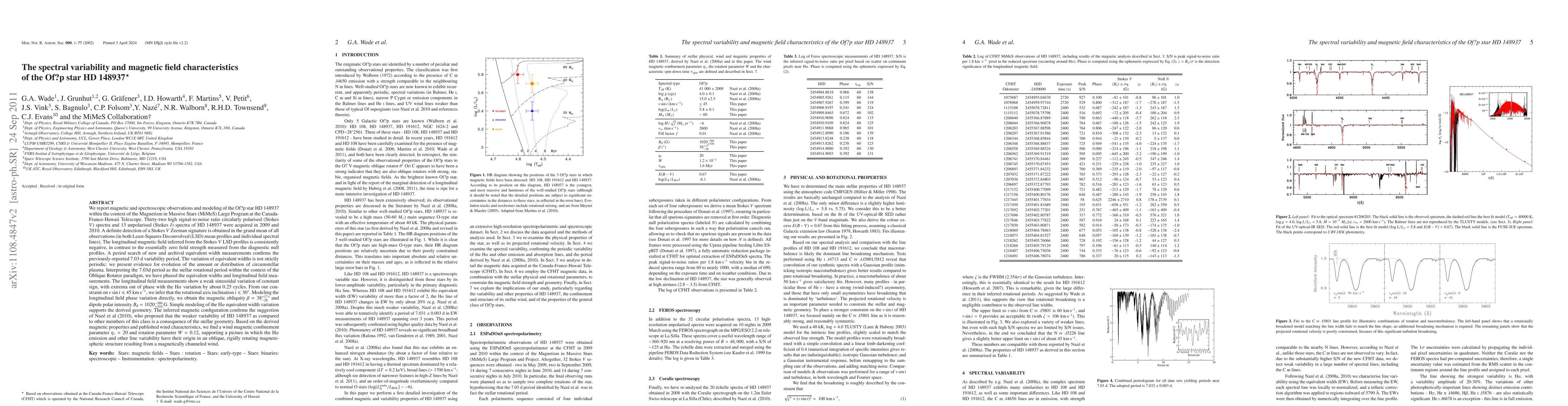 Researchers studied the star HD 148937, a member of the Of?p class, using magnetic and spectroscopic observations to reveal its spectral variability and magnetic field characteristics. The study found evidence of a negatively aligned magnetic field and a non-periodic variation in equivalent widths.