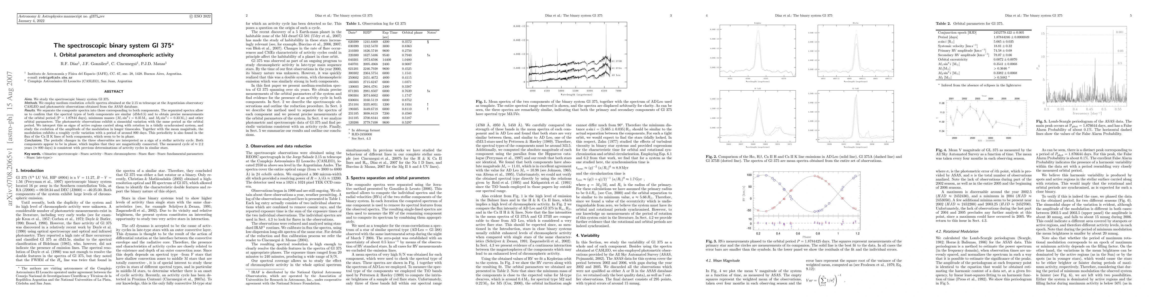 Researchers study Gl 375, a spectroscopic binary system, and find that both stars are in phase and have similar spectral types, with orbital periods of 1.87844 days and magnetic activity cycles lasting around 2.2 years.