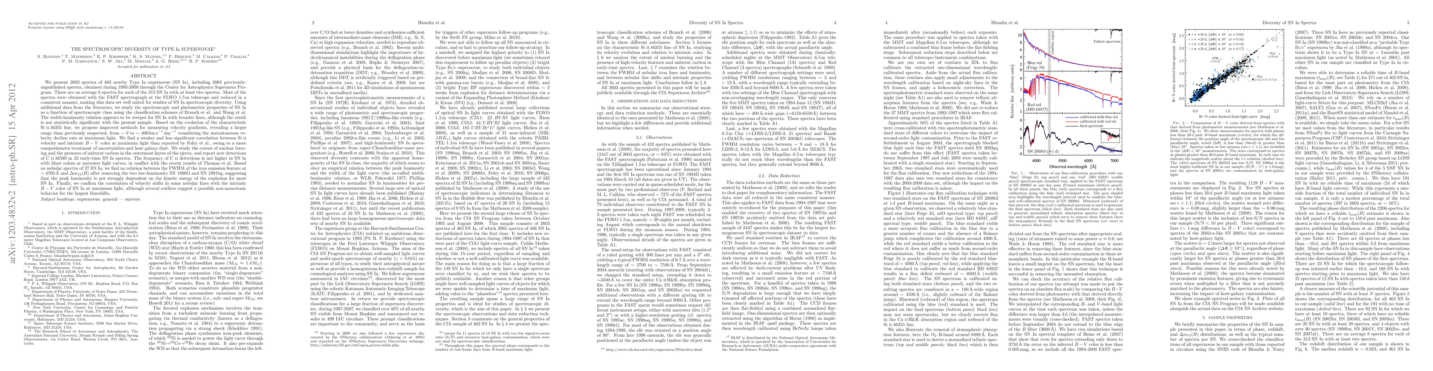 This study analyzes 2603 spectra from 462 Type Ia supernovae, revealing significant spectroscopic diversity and proposing improved methods for measuring velocity gradients. The research finds a weaker correlation between Si II velocity and intrinsic B-V color, and no strong relation between iron emission feature width and peak luminosity, suggesting diverse explosion mechanisms.