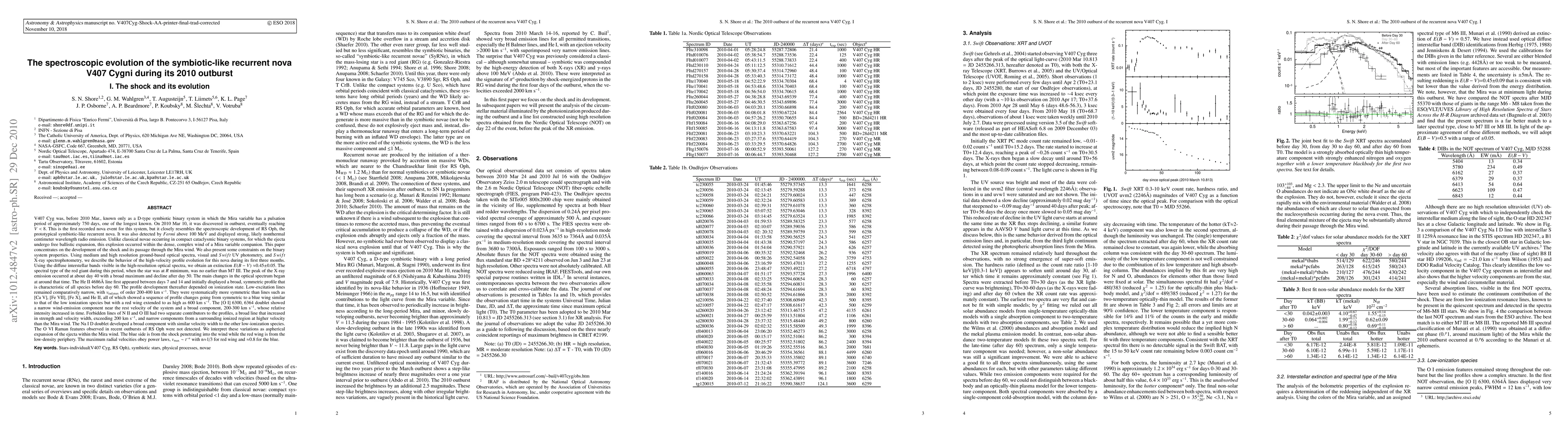 Researchers studied V407 Cygni during its 2010 outburst, discovering that the shock wave's speed increased over time in a power-law relationship, with faster speeds on the blue wing indicating penetration into the Mira wind and slower speeds on the red wing indicating expansion into low-density regions.