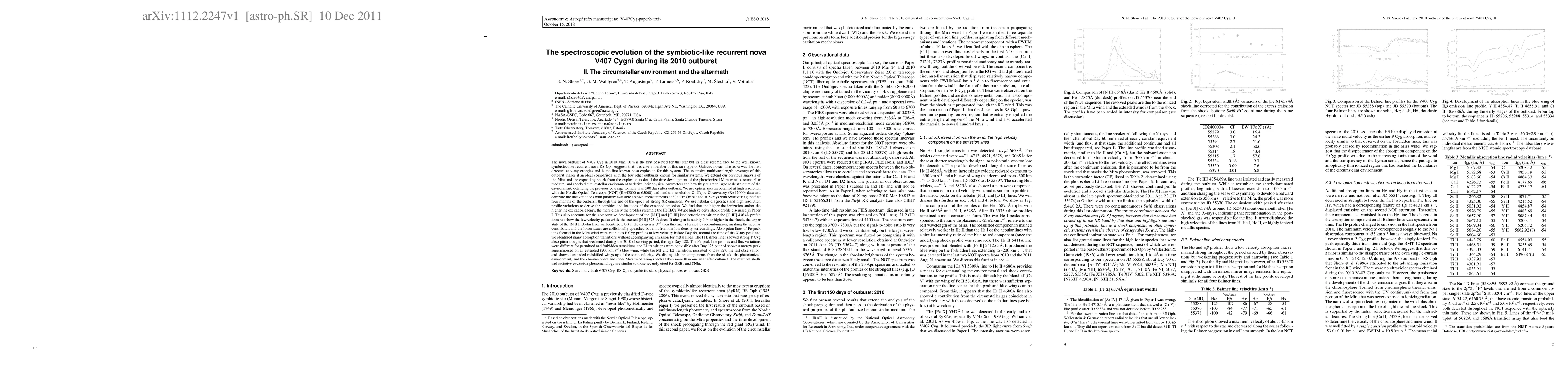 The nova outburst of V407 Cyg in 2010 Mar. 10 was the first observed for this star but its close resemblance to the well known symbiotic-like recurrent nova RS Oph suggests that it is also a member of this rare type of Galactic novae. The nova was the first detected at $\gamma$-ray energies and is the first known nova explosion for this system. The extensive multiwavelength coverage of this outburst makes it an ideal comparison with the few other outbursts known for similar systems. We extend our previous analysis of the Mira and the expanding shock from the explosion to detail the time development of the photoionized Mira wind, circumstellar medium, and shocked circumstellar environment to derive their physical parameters and how they relate to large scale structure of the environment, extending the previous coverage to more than 500 days after outburst. Absorption lines of Fe-peak ions formed in the Mira wind were visible as P Cyg profiles at low velocity before Day 69, around the time of the X-ray peak and we identified many absorption transitions without accompanying emission for metal lines. The H Balmer lines showed strong P Cyg absorption troughs that weakened during the 2010 observing period, through Day 128. We distinguish the components from the shock, the photoionized environment, and the chromosphere and inner Mira wind using spectra taken more than one year after outburst. The multiple shells and radiative excitation phenomenology are similar to those recently cited for GRBs and SNIa (severely truncated)