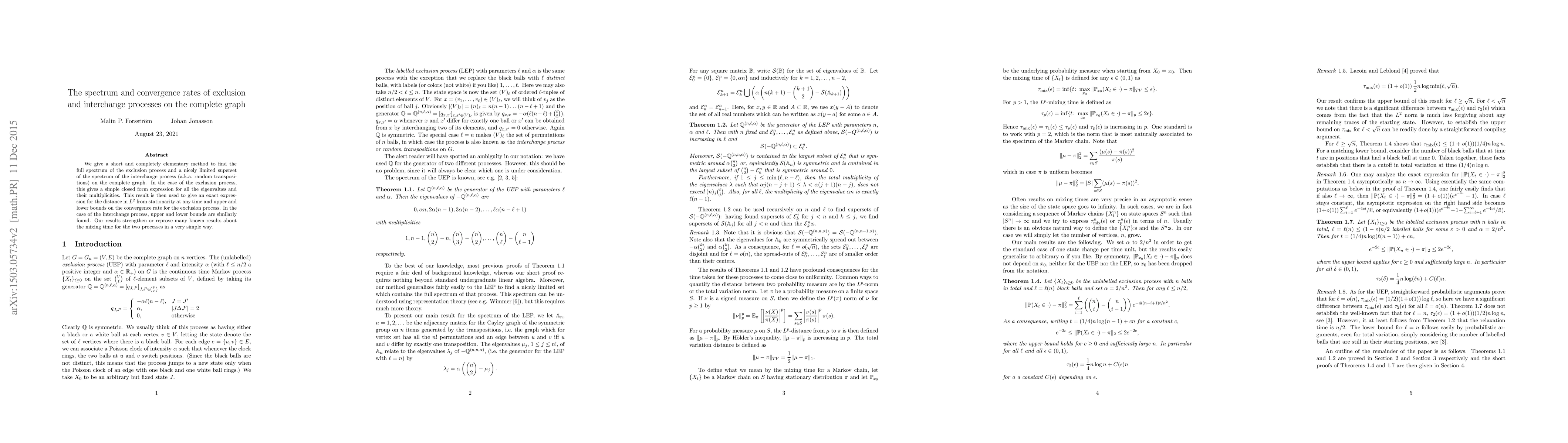 This paper presents an elementary method to determine the full spectrum of the exclusion process and a subset of the interchange process on a complete graph, providing closed-form expressions for eigenvalues and their multiplicities. It also derives exact expressions for the convergence rate and mixing time for both processes, strengthening existing results.