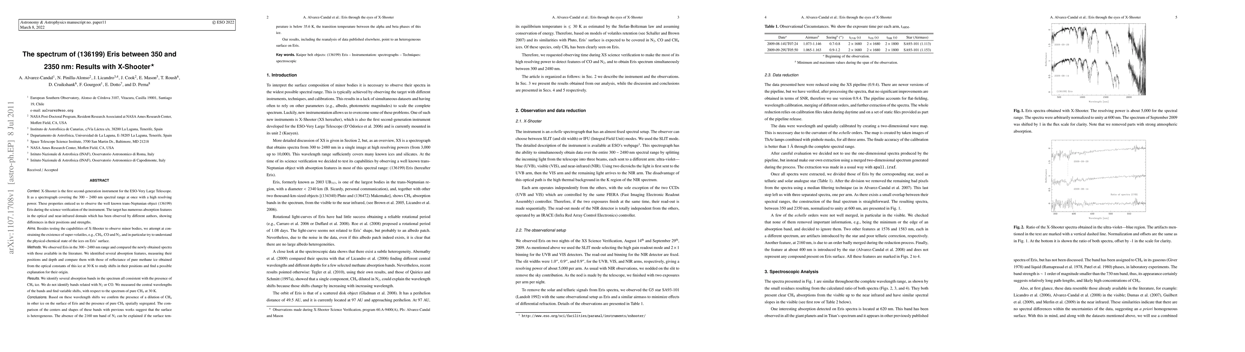 The study uses X-Shooter spectrograph to analyze Eris's surface composition, finding evidence of methane ice with variable shifts in absorption bands, suggesting a heterogeneous surface.