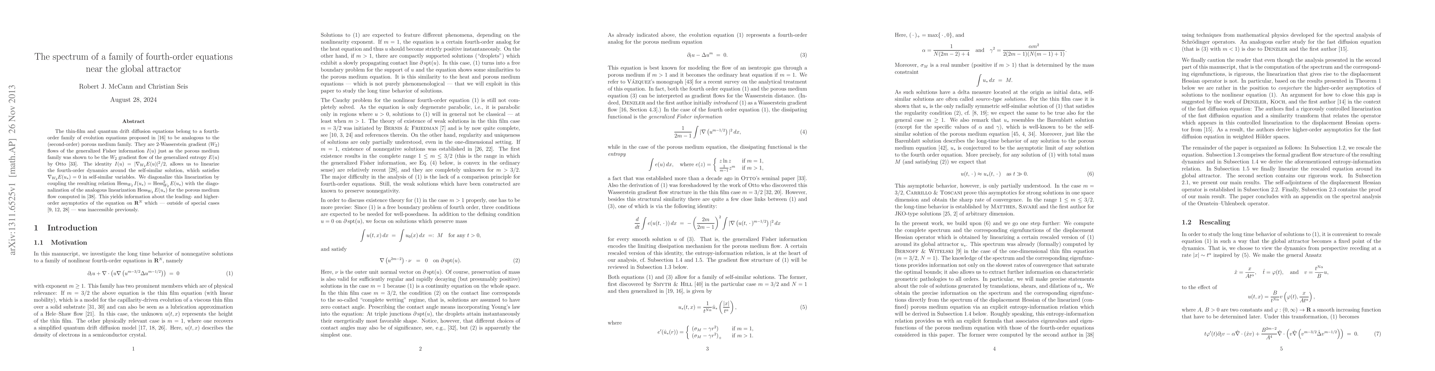 The thin-film and quantum drift diffusion equations belong to a fourth-order family of evolution equations proposed in ref. 16 to be analogous to the (second-order) porous medium family. They are $2$-Wasserstein gradient ($W_2$) flows of the generalized Fisher information $I(u)$ just as the porous medium family was shown to be the $W_2$ gradient flow of the generalized entropy $E(u)$ by Otto. The identity $I(u) = |\nabla_{W_2} E(u)|^2/2$ (formally) becomes $\Hess_{W_2} I(u_*) =\Hess_{W_2}^2 E(u_*)$ when linearizing the equation around its self-similar solution $u_*$. We couple this relation with the diagonalization of $\Hess_{W_2} E(u_*)$ for the porous medium flow computed in ref. 38. This yields information about the leading- and higher-order asymptotics of the equation on $\R^N$ which --- outside of special cases --- was inaccessible previously.
