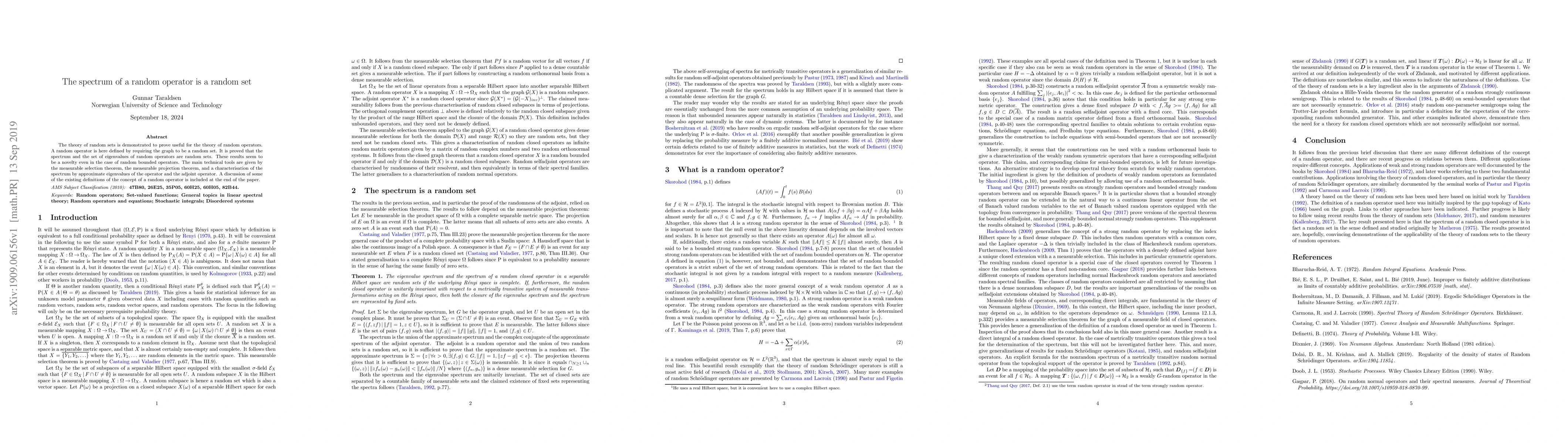The spectrum of random operators is a random set, demonstrating the connection between random sets theory and linear spectral theory. This finding has implications for understanding random equations and stochastic integrals in disordered systems.