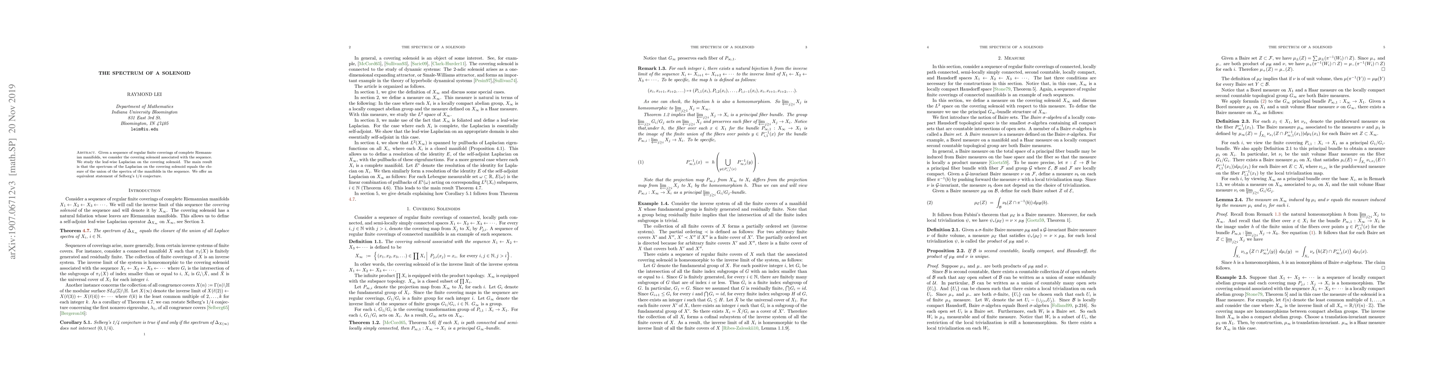 Given a sequence of regular finite coverings of complete Riemannian manifolds, we consider the covering solenoid associated with the sequence. We study the leaf-wise Laplacian on the covering solenoid. The main result is that the spectrum of the Laplacian on the covering solenoid equals the closure of the union of the spectra of the manifolds in the sequence. We offer an equivalent statement of Selberg's 1/4 conjecture.