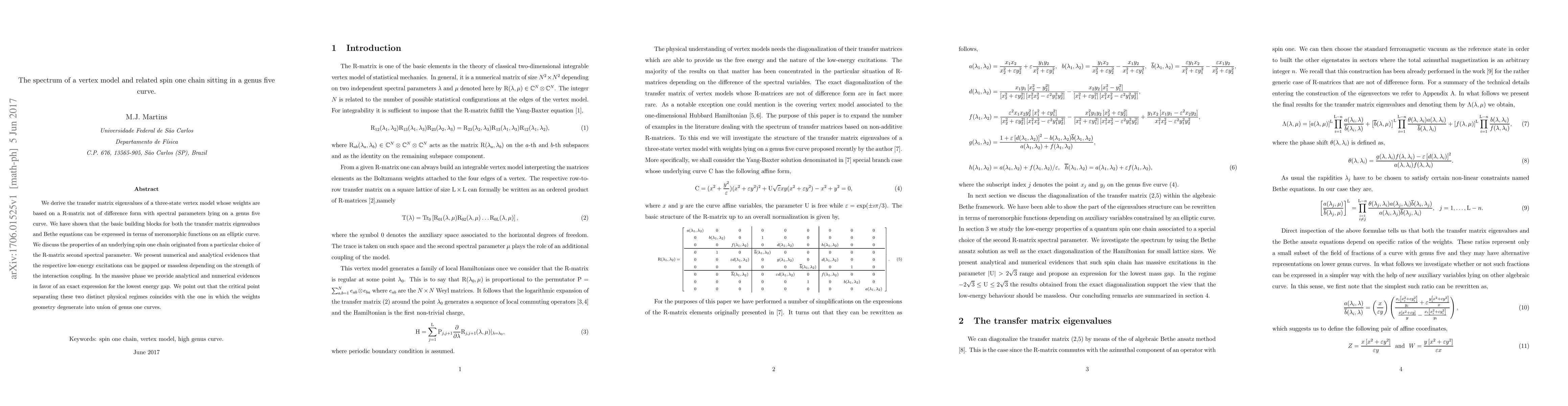 We derive the transfer matrix eigenvalues of a three-state vertex model whose weights are based on a $\mathrm{R}$-matrix not of difference form with spectral parameters lying on a genus five curve. We have shown that the basic building blocks for both the transfer matrix eigenvalues and Bethe equations can be expressed in terms of meromorphic functions on an elliptic curve. We discuss the properties of an underlying spin one chain originated from a particular choice of the $\mathrm{R}$-matrix second spectral parameter. We present numerical and analytical evidences that the respective low-energy excitations can be gapped or massless depending on the strength of the interaction coupling. In the massive phase we provide analytical and numerical evidences in favor of an exact expression for the lowest energy gap. We point out that the critical point separating these two distinct physical regimes coincides with the one in which the weights geometry degenerate into union of genus one curves.