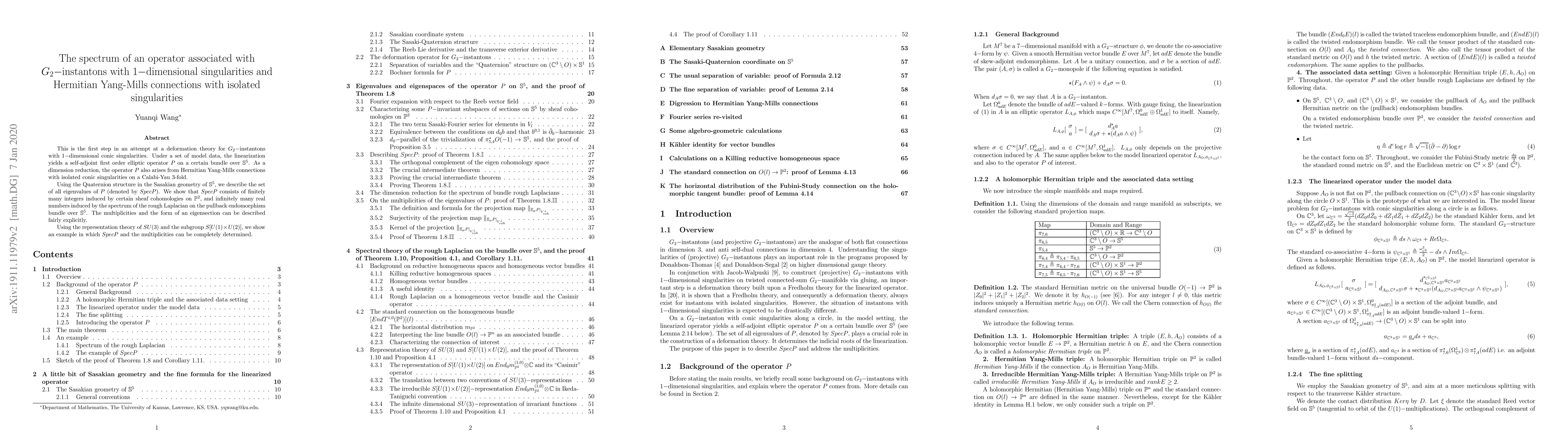 This paper introduces a deformation theory for G_2-instantons with 1-dimensional conic singularities, focusing on a self-adjoint elliptic operator P arising from model data on S^5. The spectrum of P, denoted Spec P, is described as finitely many integers from sheaf cohomologies on P^2, and infinitely many real numbers from the rough Laplacian's spectrum on the pullback endomorphism bundle over S^5. Using SU(3) and S[U(1) x U(2)] representation theory, the authors demonstrate a case where Spec P and multiplicities can be fully determined.