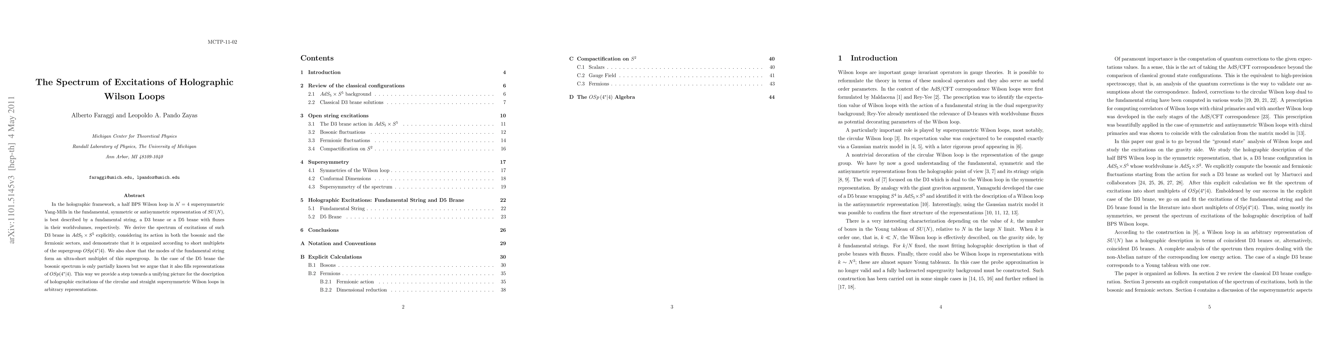 In the holographic framework, a half BPS Wilson loop in ${\cal N}=4$ supersymmetric Yang-Mills in the fundamental, symmetric or antisymmetric representation of SU(N), is best described by a fundamental string, a D3 brane or a D5 brane with fluxes in their worldvolumes, respectively. We derive the spectrum of excitations of such D3 brane in $AdS_5\times S^5$ explicitly, considering its action in both the bosonic and the fermionic sectors, and demonstrate that it is organized according to short multiplets of the supergroup $OSp(4^*|4)$. We also show that the modes of the fundamental string form an ultra-short multiplet of this supergroup. In the case of the D5 brane the bosonic spectrum is only partially known but we argue that it also fills representations of $OSp(4^*|4)$. This way we provide a step towards a unifying picture for the description of holographic excitations of the circular and straight supersymmetric Wilson loops in arbitrary representations.