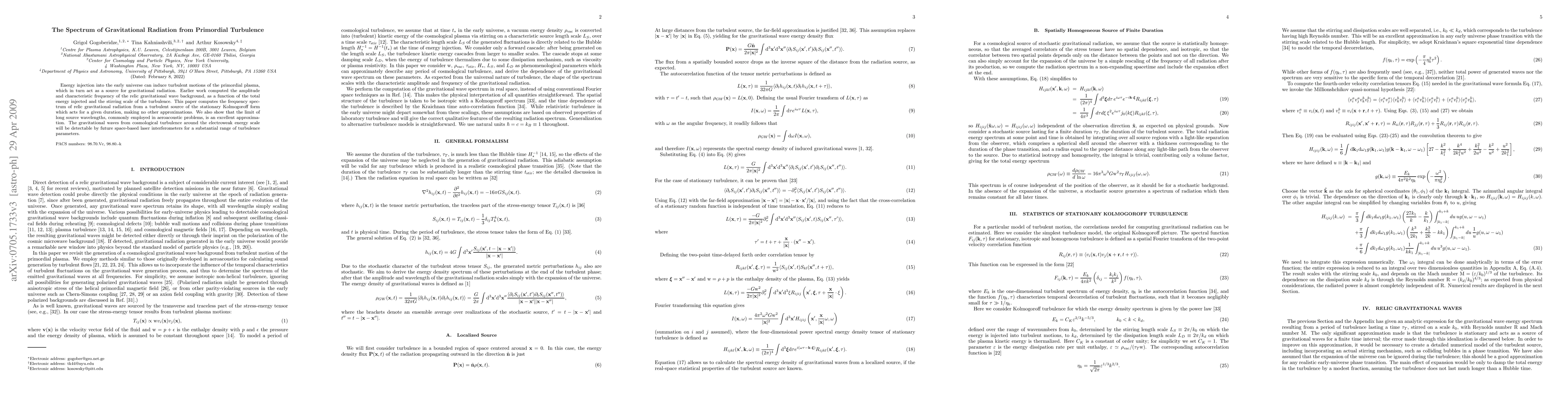 This paper investigates the frequency spectrum of gravitational radiation from primordial turbulence in the early universe, demonstrating that such turbulence can generate a detectable relic gravitational wave background. It finds that the long wavelength limit is a good approximation and predicts that future space-based interferometers could observe these waves over a range of turbulence parameters.