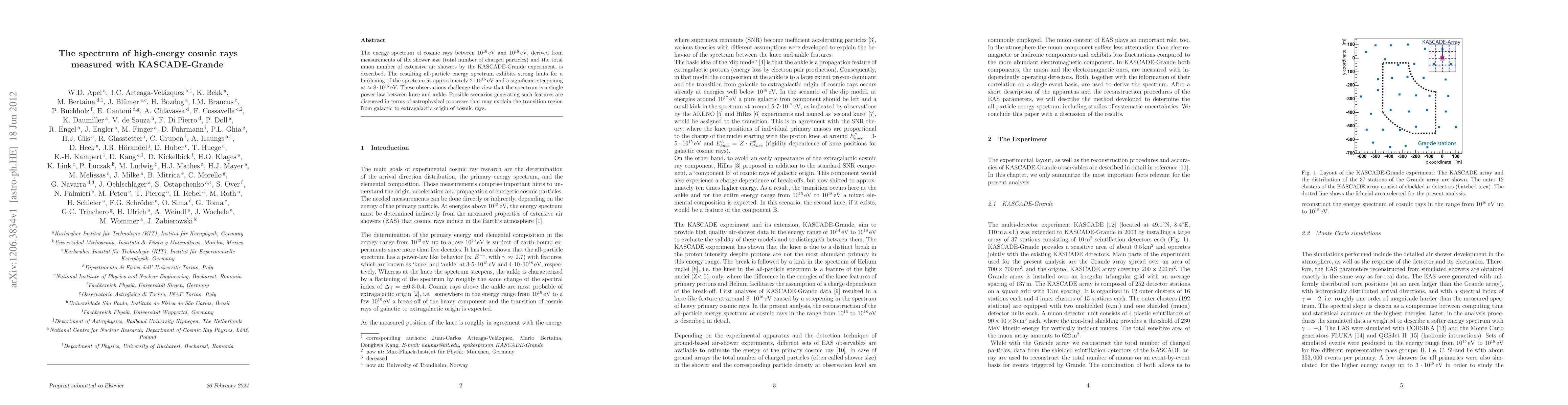 The KASCADE-Grande experiment's measurements reveal a non-uniform energy spectrum of cosmic rays, with hints of a hardening at 2x10^16 eV and steepening at 8x10^16 eV, challenging the single power law model.