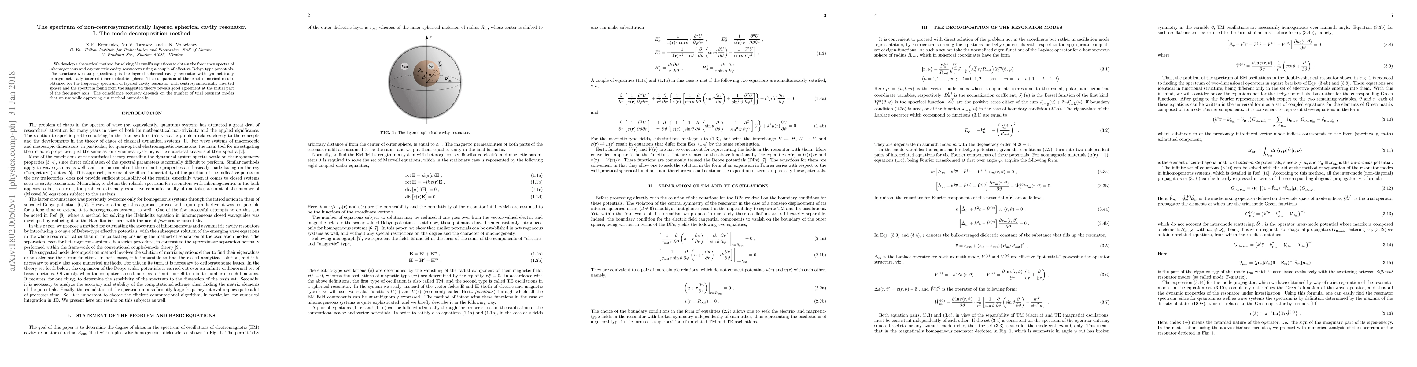 This paper introduces a theoretical method to solve Maxwell's equations for non-centrosymmetric layered spherical cavity resonators, using effective Debye-type potentials. The method's accuracy is validated by comparing its results with exact numerical calculations for both symmetric and asymmetric configurations.