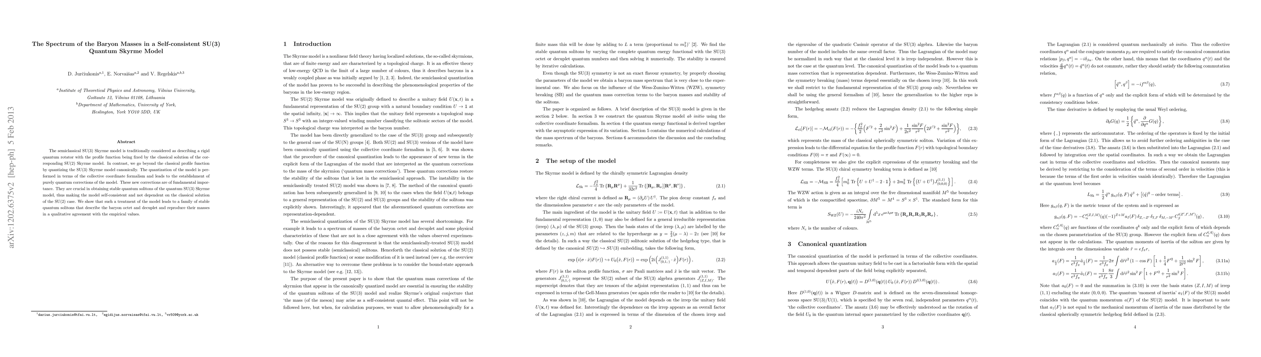 This paper quantizes the SU(3) Skyrme model beyond the classical profile function, establishing purely quantum corrections that stabilize quantum solitons. These corrections enable the model to self-consistently describe the baryon octet and decuplet, reproducing their masses in qualitative agreement with empirical data.