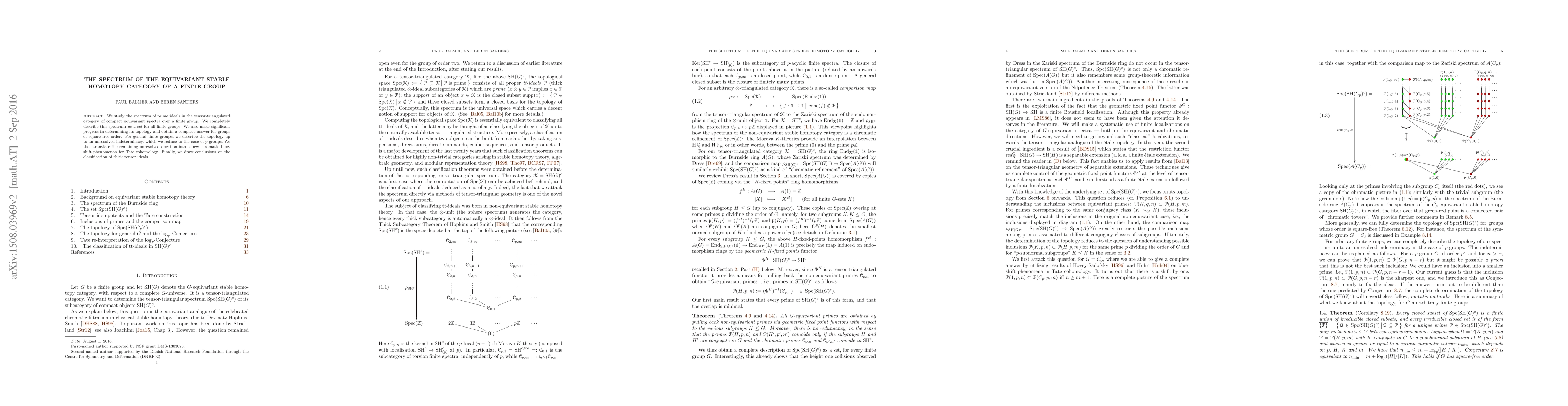 This paper describes the spectrum of prime ideals in the equivariant stable homotopy category for finite groups, providing a complete topological description for groups of square-free order and reducing the general case to an unresolved issue related to p-groups and a new chromatic blue-shift phenomenon in Tate cohomology. It also concludes on the classification of thick tensor ideals.