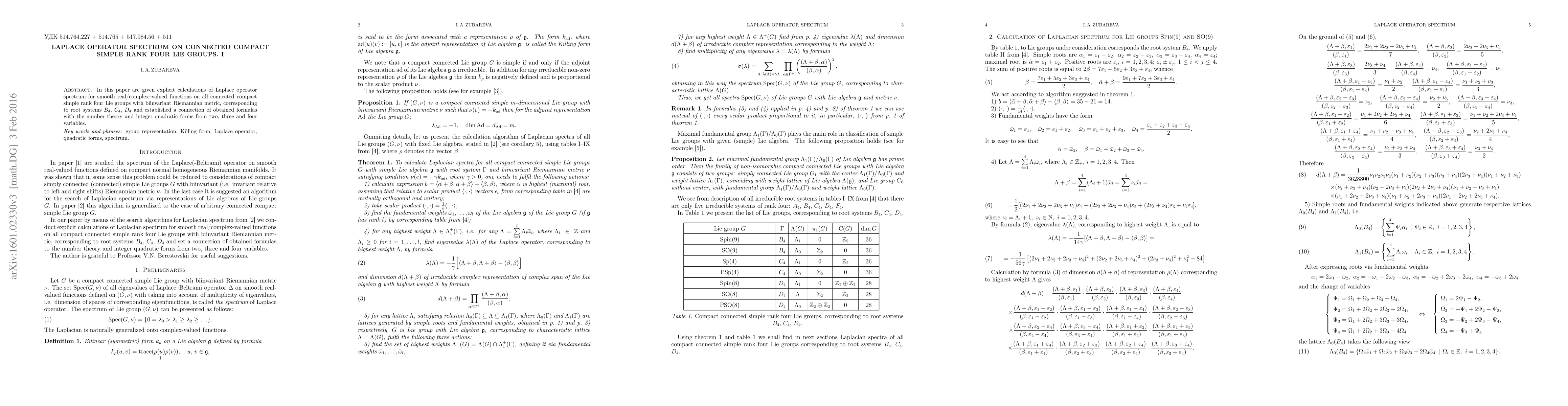 This paper provides explicit calculations of the Laplace operator spectrum for smooth functions on connected compact simple rank four Lie groups with biinvariant metrics, and connects these results with number theory and integer quadratic forms.