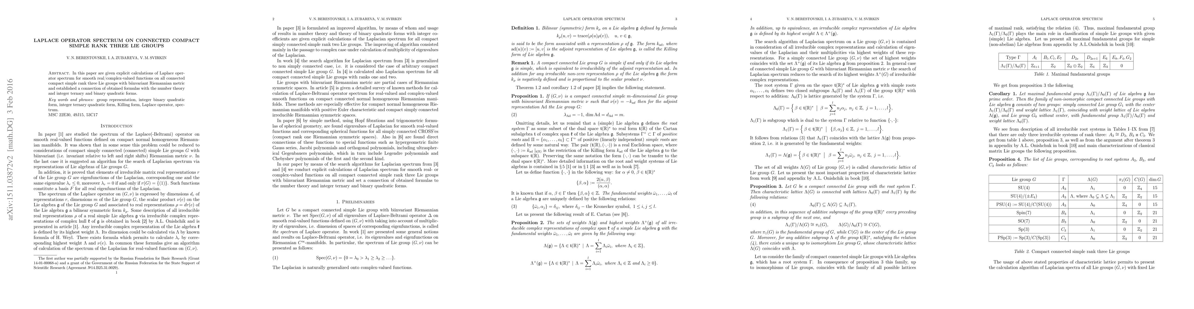 This paper provides explicit calculations of the Laplace operator spectrum for smooth functions on connected compact simple rank three Lie groups, establishing a link between the obtained formulas and number theory, specifically integer ternary and binary quadratic forms.