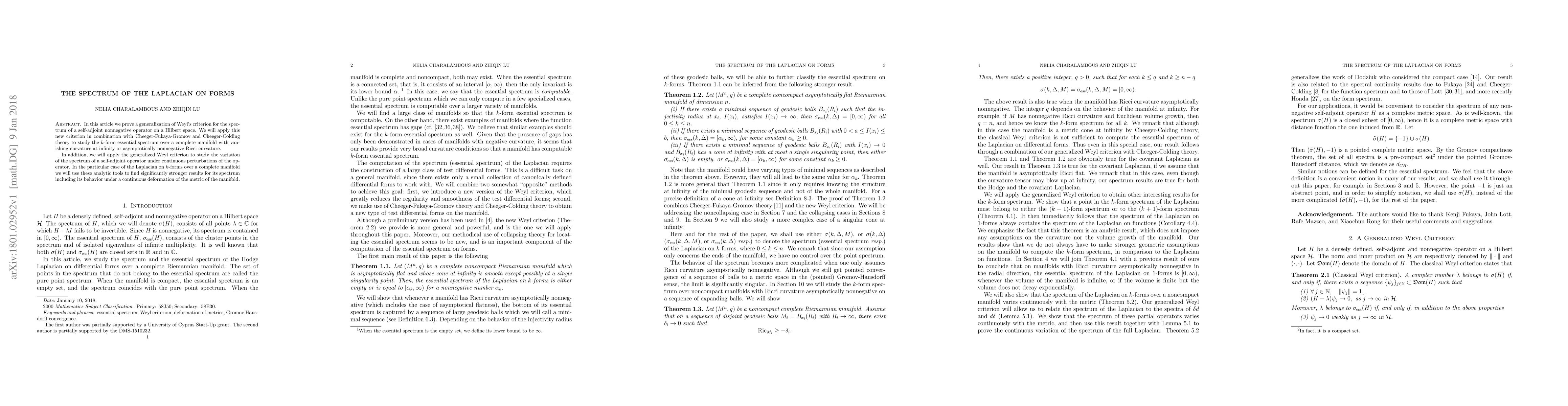 This paper proves a generalization of Weyl's criterion for self-adjoint nonnegative operators on Hilbert spaces, applying it to study the spectrum of the Laplacian on forms over complete manifolds with vanishing or asymptotically nonnegative curvature.