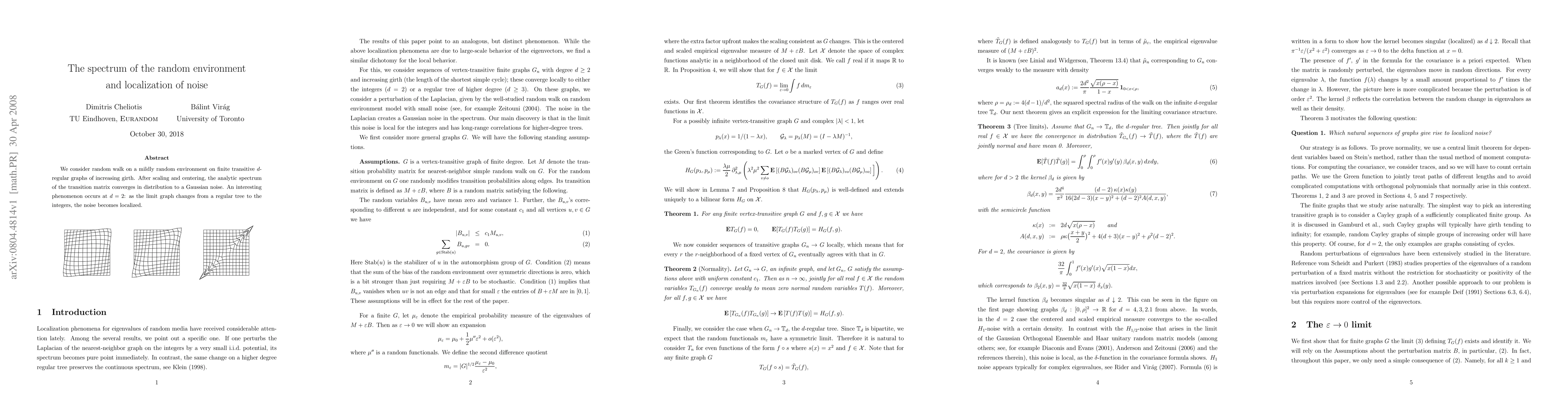 We consider random walk on a mildly random environment on finite transitive d- regular graphs of increasing girth. After scaling and centering, the analytic spectrum of the transition matrix converges in distribution to a Gaussian noise. An interesting phenomenon occurs at d = 2: as the limit graph changes from a regular tree to the integers, the noise becomes localized.